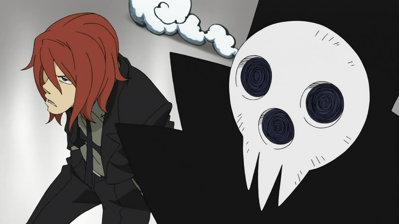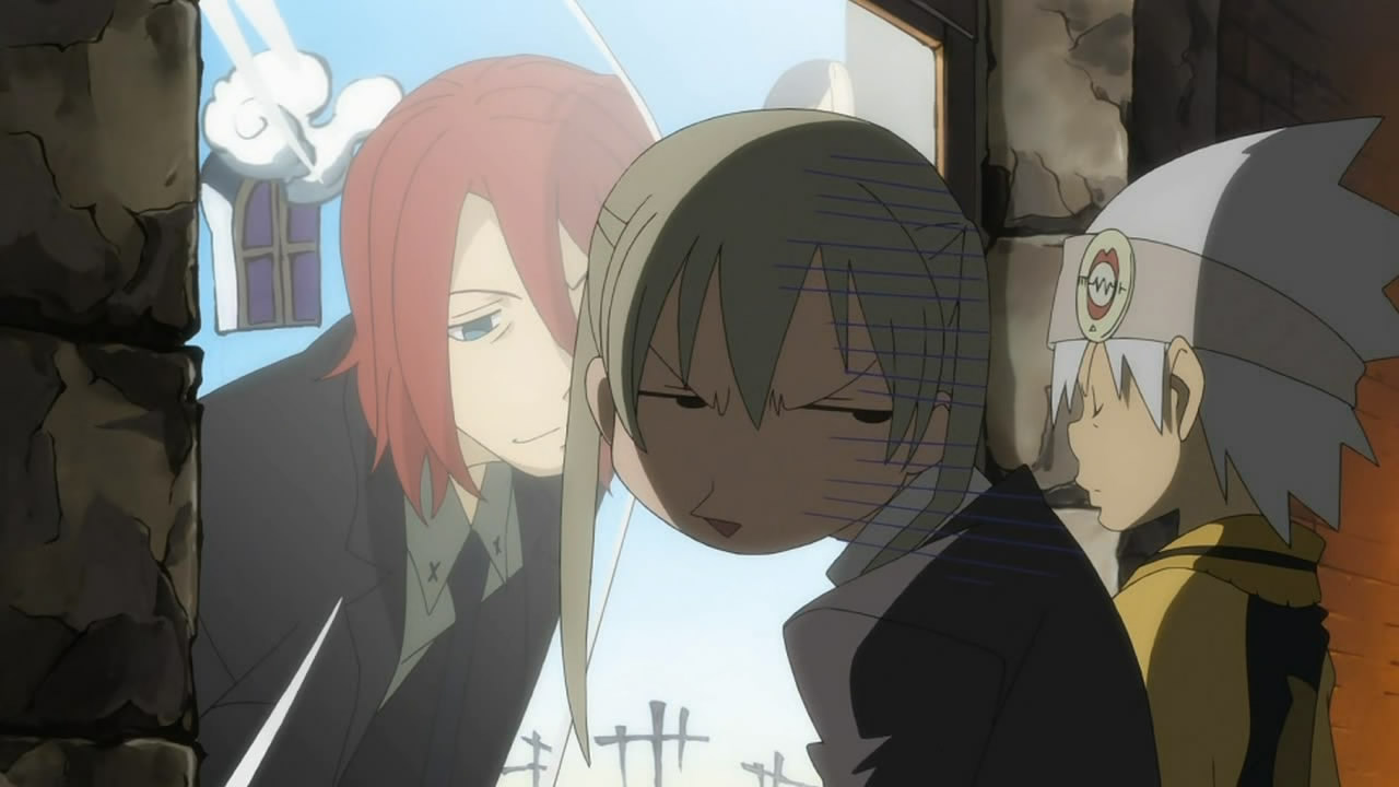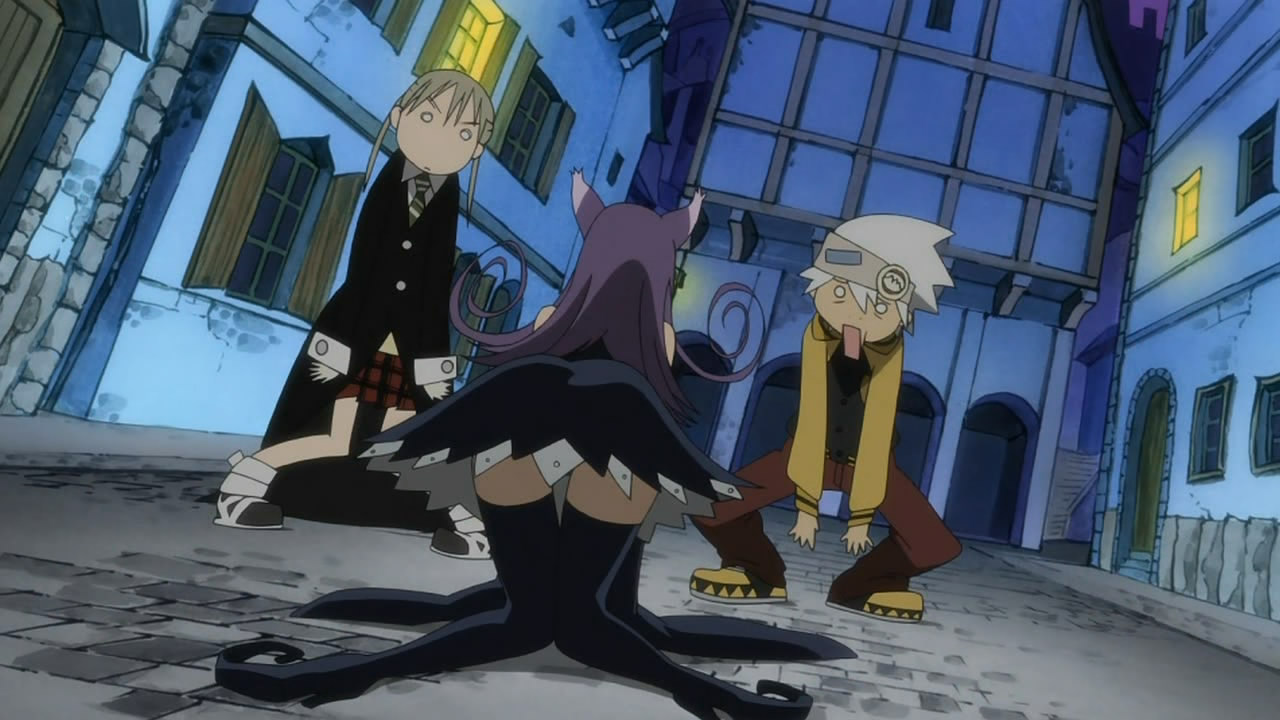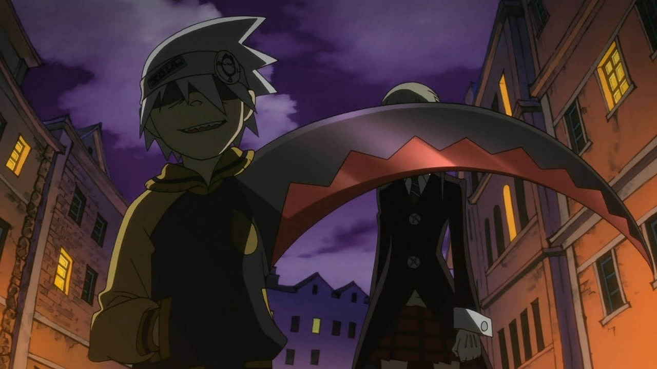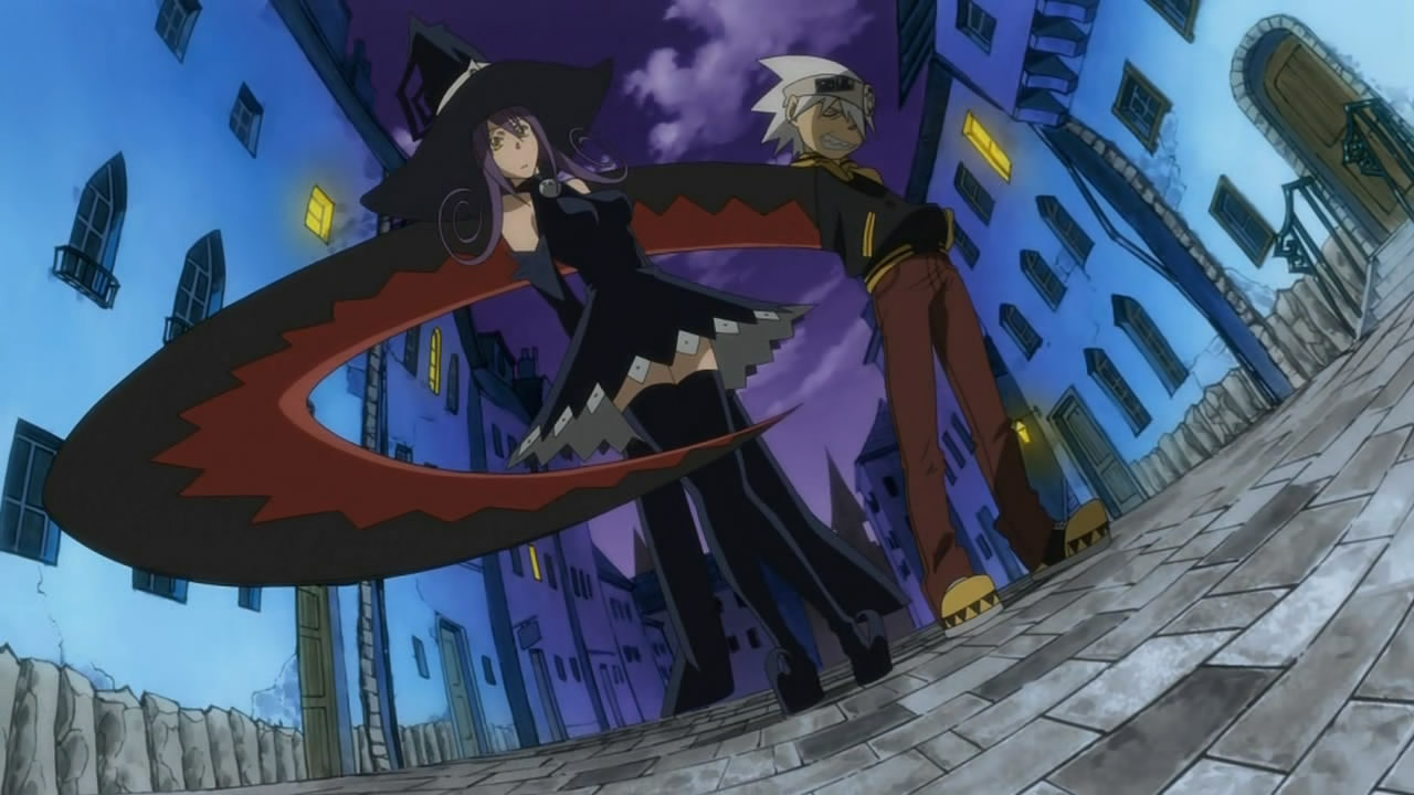 In order to battle evil Kishin (fierce gods), Shinigami-sama (aka Grim Reaper) has founded the Shinigami Buki Shokunin Senmon Gakkou (Grim Reaper Weapon and Artisan Vocational School) – Shibusen for short – in the middle of his hometown Death City in Nevada, USA. Er. Its purpose is to produce mighty Death Scythe weapons for Shinigama’s use, which is done through a process of feeding the weapon 99 evil souls plus one witch soul, which transforms it into something much more powerful. These Weapons, however, are a somewhat modified race of humanoids, who can morph into lethal shapes at will. To help them fight, they (mostly) need the help of an Artisan to wield them, and the show’s plot follows three such pairs. The first episode introduces us to the first couple, the Weapon Soul (Eater) and his Artisan ladyfriend Maka (Albahn), and they’re having a bit of trouble getting that final witch soul. Subsequent episodes seem to deal with the Nakatsukasa Tsubaki (Weapon) / Black Star (Artisan) pair, while the third and final couple isn’t so much a couple as a threesome, with sisters Liz and Patty Thompson (Weapons) and Death The Kid (Artisan).