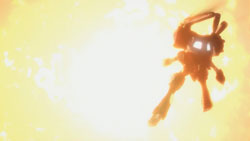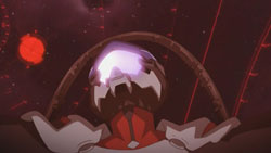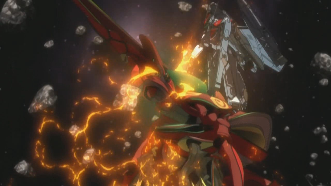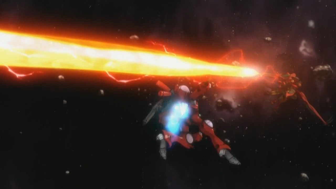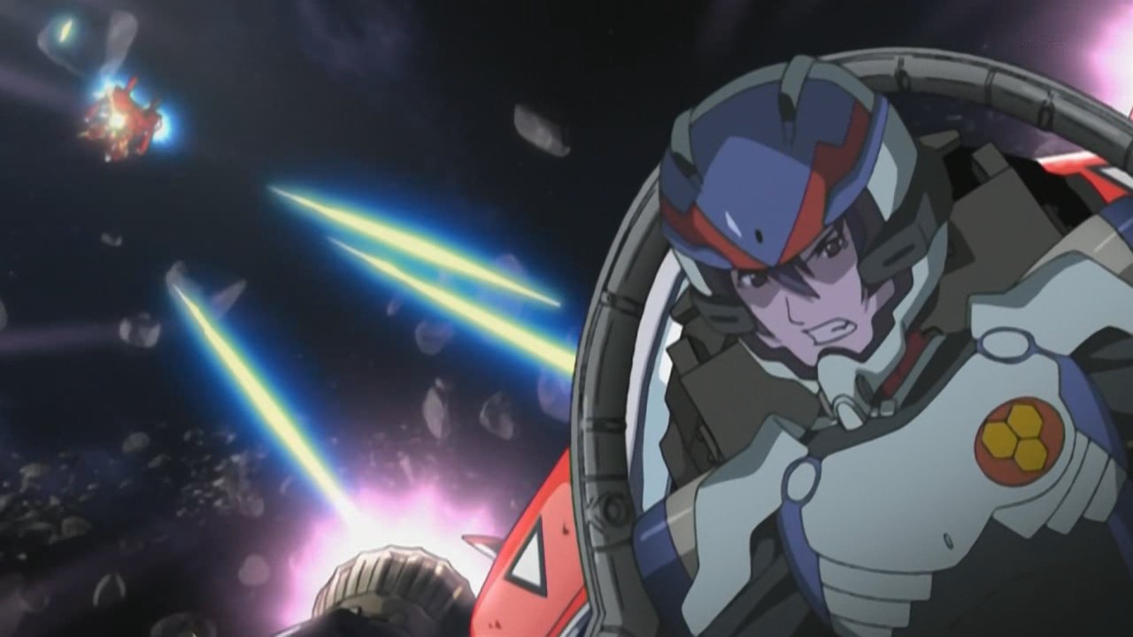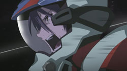 At around the same time that Alto and company engage in battle, Ranka’s turn to perform comes up in the contest. She sees that Alto isn’t there anymore and accidentally hits her head against the microphone, but she eventually regains her composure and starts singing the legendary song, Watashi no Kare wa Pilot. Alto meanwhile manages to defeat one of the dark-colored Queadluuns, however he then gets targeted by the red Queadluun. This leads to a heated dogfight through the asteroid field, and it is interrupted when a large red Vajra suddenly appears. Seeing it reminds Alto of how Ozma had earlier told him about the 117th Massive Research Fleet incident from 11 years ago. Officially, it was reported as an accident where 1000 people died, but Ozma had revealed that those people were actually annihilated by the Vajra. Ranka was a survivor of that. Remembering how terrified Ranka had looked after finding out that her brother was hurt, Alto ignores Mikhail’s warnings and charges at the Vajra with his VF-25’s knife drawn.