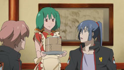 In the aftermath, Alto, Luca, and Mikhail go to the Nyan Nyan restaurant to celebrate, and Kuran Kuran and her two wingmen show up too. Alto is surprised to see how young Kuran Kuran looks in her micronized form, and Mikhail angers her by teasing her about it. The waitress Ranka then brings Alto some buns, and, based on what’s on TV right now, Alto realizes that she didn’t win the Miss Macross contest. He apologizes for not staying until the end, but Ranka doesn’t mind and changes the subject to how Alto has joined the S.M.S. When she asks him why he’s taking such a tough job, Alto explains that he thinks of it as a chance, and he urges Ranka not to give up. The following day, Alto is walking by himself when he suddenly gets tripped. The person who stuck her foot out turns out to be none other than Sheryl Nome.