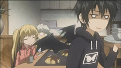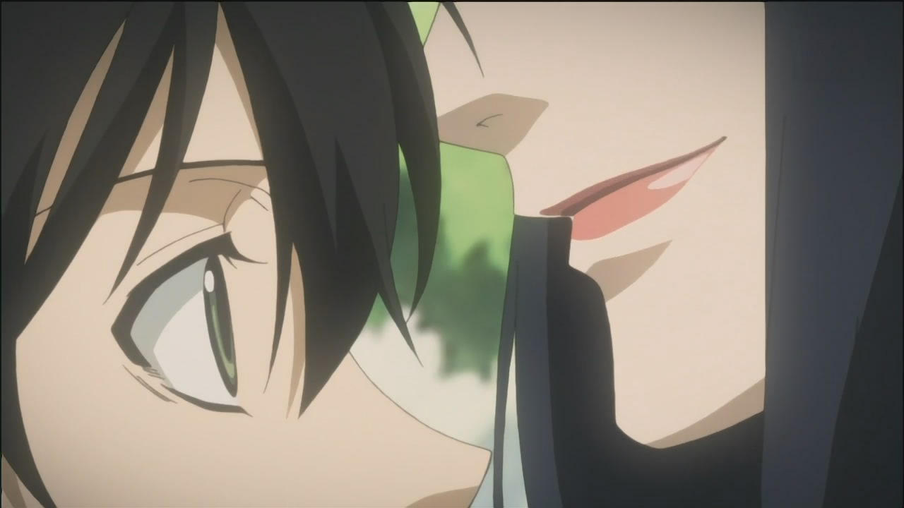 After informing her subordinates of a Nabari world job, Oda Yae, leader of the Togakushi, and newcomer Katou Sourou head off to Banten village. At Miharu’s okonomiyaki store, Kumohira thinks something has happened to Miharu and that he’s been told not to talk, but Miharu brushes aside his questions with his “technique“. While Kumohira tells Miharu that he doesn’t want to take away his freedom or worry his grandmother with all the Nabari world affairs, he feels that he hasn’t been able to do anything properly thus far, so Miharu tells him to just continue sticking (i.e. flirting) with him to protect him as promised. When Kumohira says that’s disturbing and that he’s been naive so far in his thinking, Miharu simply tells him it’s okay if he remains naive like that and that the Kairoushuu won’t go after him for the next while according to Yoite. Hearing this, Kumohira wishes that Miharu would rely on him more, but Miharu simply says that no one even knows what he’ll do when the time to claim the Ruler of Nabari comes.