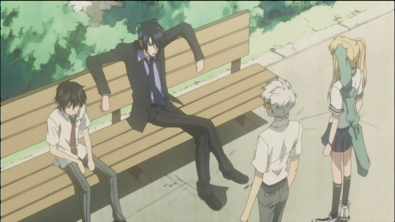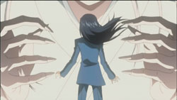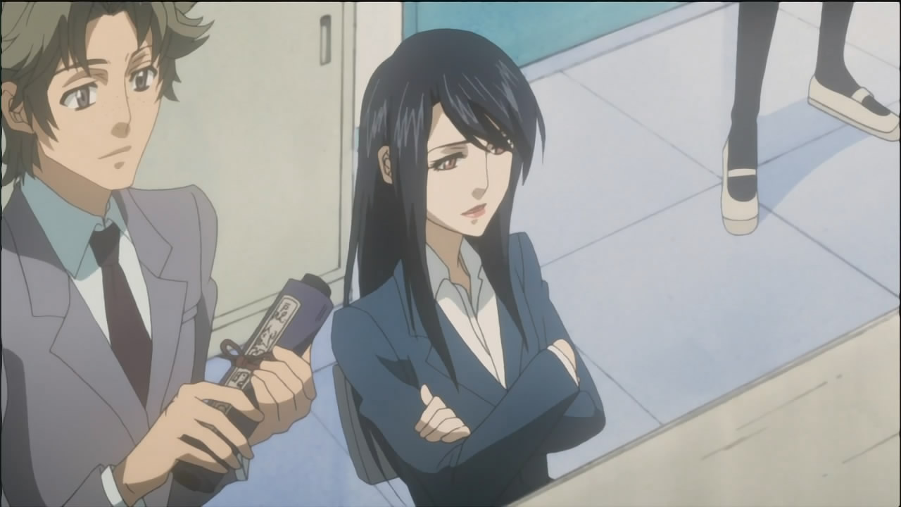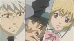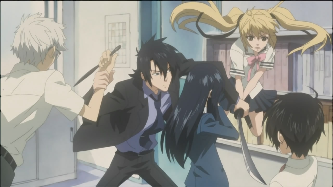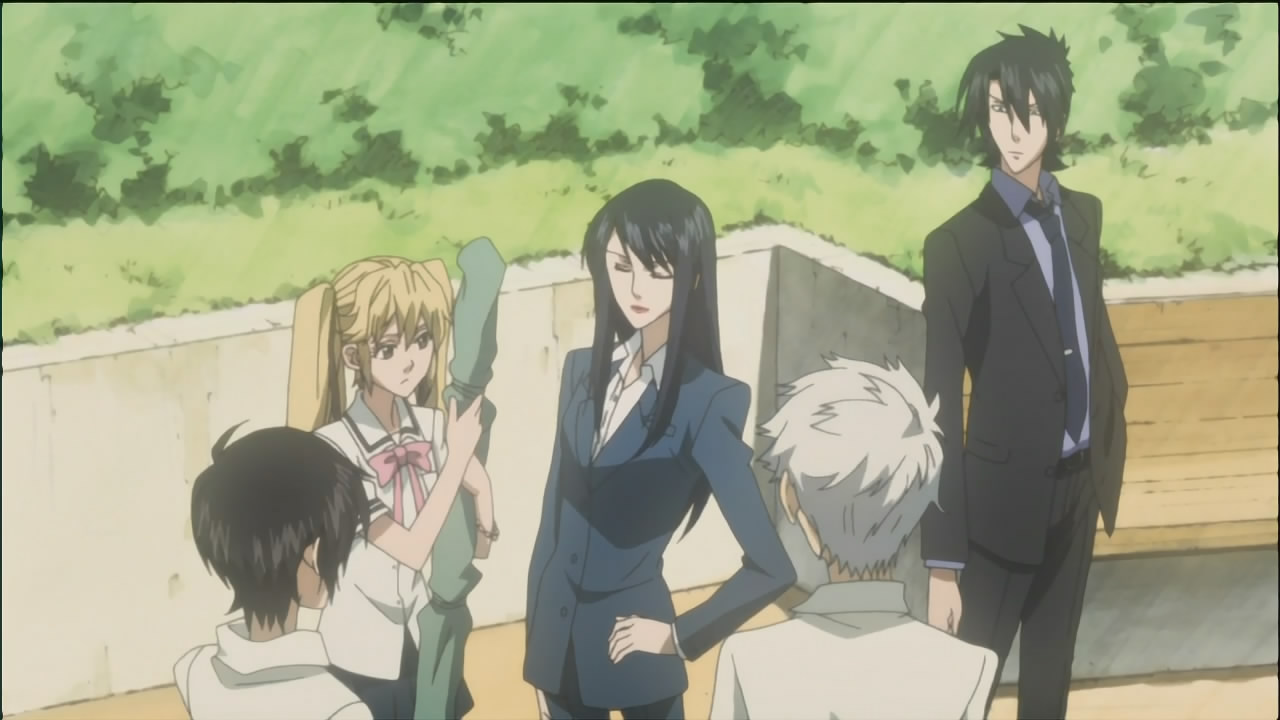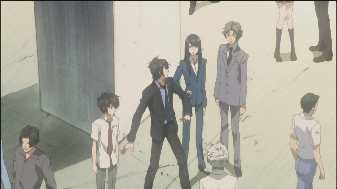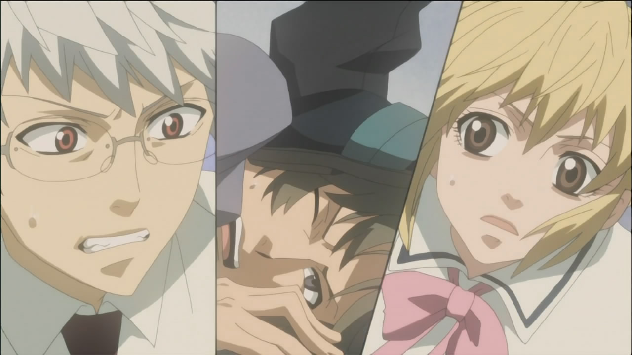 At school, Kouichi is trying to discuss the whereabouts of the kinjutsusho, but no one seems to be listening. Shortly after, Yae and Sourou arrive, the former of which surprises everyone with her ability to read their minds. While Yae starts talking about how they are feigning innocence or bearing hatred, she begins to mention how Kumohira carries memories that he wants no one to know about, but Kumohira stops her with a kunai at her throat. Realizing that the naive Kumohira would’ve stopped his attack anyway, Yae introduces herself as the leader of the Togakushi and president of the employment agency Fog Blue, and then insists on their cooperation.
