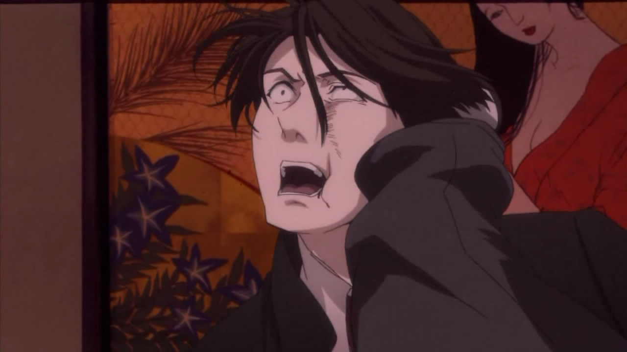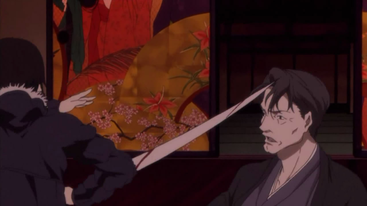 Benika says that if it ends up the same as Souju, then let it be up to Murasaki. If she likes Ryuuji, then that’s fine, but if she doesn’t, then to give up on the arranged pairing. Hearing that it was Souju’s dying request, Renjou seems inclined to agree with their demands, despite Ryuuji and Kazuko’s protests. Out of rage, Ryuuji then stabs Benika (with the blood censored completely), which causes Shinkurou to uncontrollably activate his Houzuki bone technique and cut him down. Just as Shinkurou’s about to deliver the killing blow though, Benika stops him. While Renjou is shocked to see the Houzuki technique, Shinkurou proclaims that it’s his fault that everyone’s crying and demands that he free Murasaki. Renjou retorts why he should listen a person who acquired such a murderous technique, but Shinkurou says that he won’t kill and that he’s not like him. (It sure seemed like he was going to kill Ryuuji two seconds ago though…)