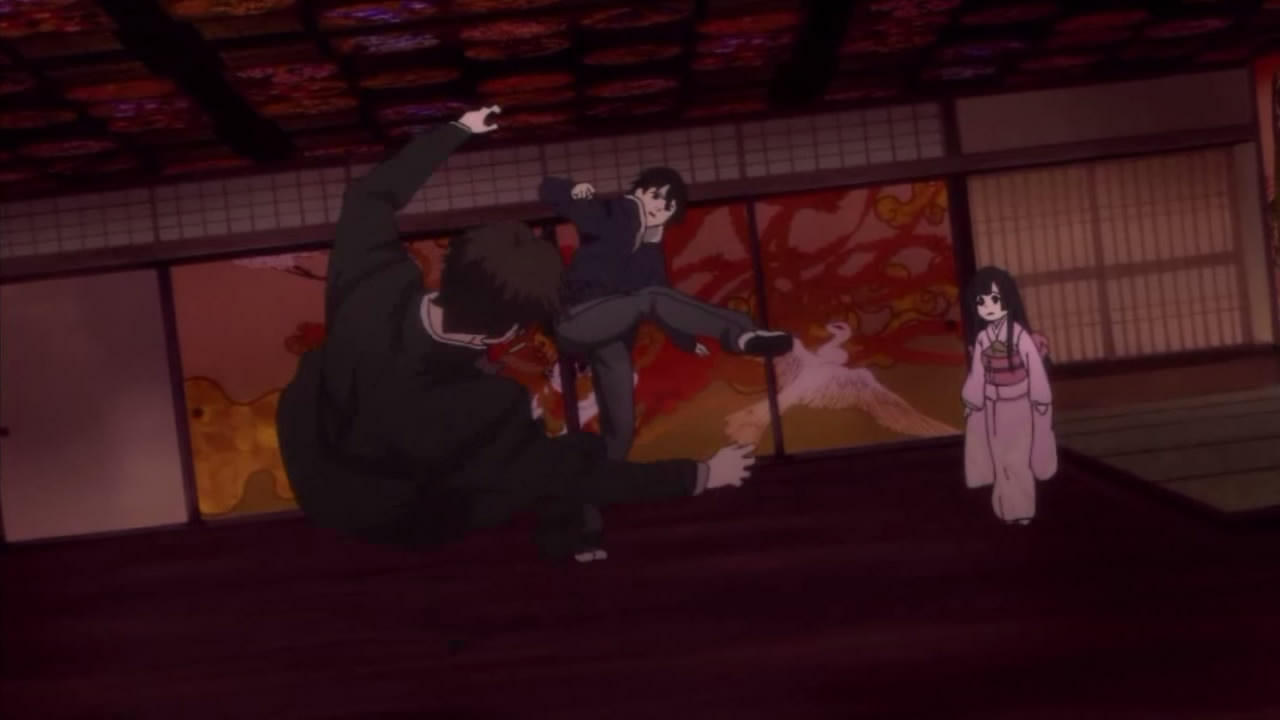 Realizing that Shinkurou headed back to the Kuhouin household, Benika and Yayoi also decide to head back, but are pursued by Lin Chenshin. In the Inner Sanctuary, Shinkurou is met by Renjou, who tells him to leave if he doesn’t want to die. However, when Shinkurou says that Murasaki doesn’t want to become like her mother Souju, Renjou reaffirms if Murasaki really said such a thing. Before their conversation can continue further though, Benika and Lin burst through the room in their cars (apparently Benika thinks it’s a parking lot…), which results in Lin crashing into the pond/lake outside. Benika and Shinkurou then go deeper into the Inner Sanctuary in search of Murasaki and find Ryuuji with her. Shinkurou manages to defeat him using his Houzuki fighting style, something Ryuuji isn’t familiar with. Meanwhile, Yayoi is beating up Lin in the same manner, having learned some of the Houzuki style from Shinkurou before. Lin being unfamiliar with this style as well, gets defeated just as easily as Ryuuji did. (Power to the Houzuki-ryuu!)