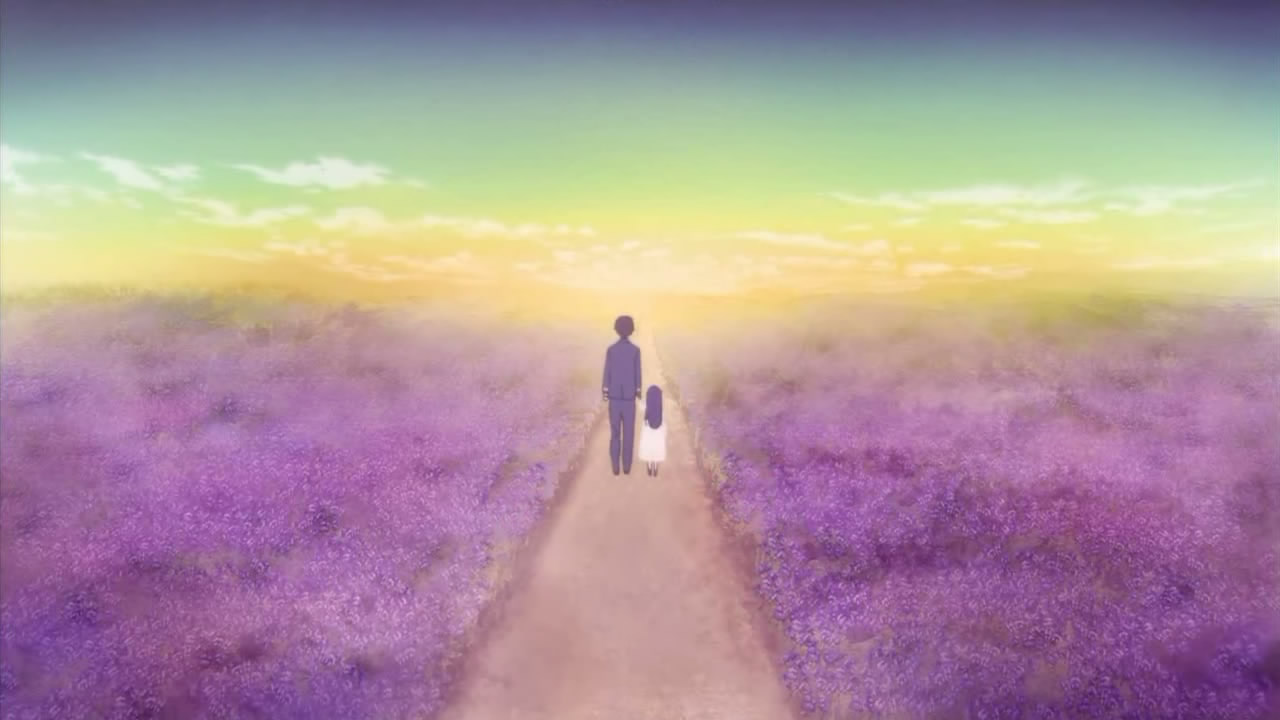 Before Shinkurou and the others depart, he gives Murasaki the scarf Yamie made and a group picture from her Shichi-Go-San that Tamaki took. Murasaki leaves Shinkurou with some encouraging and optimistic words, before the two finally depart. On their car ride home (with Benika wondering if it’s normal not to call an ambulance in this situation…), Shinkurou mails Tamaki, Yuuno, and Ginko, letting them know how everything went. Meanwhile, Murasaki talks to Renjou about the things she learned in the outside world and the two of the reminisce about her mother, who smiled the most when she quietly carried Murasaki during walks. Asleep in the car, Shinkurou dreams about him and Murasaki walking happily along a narrow yet tranquil, violet, hill road.