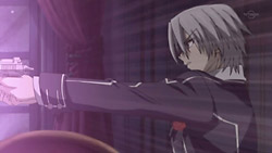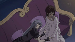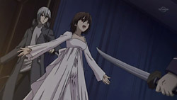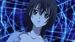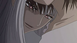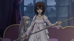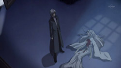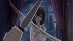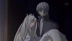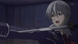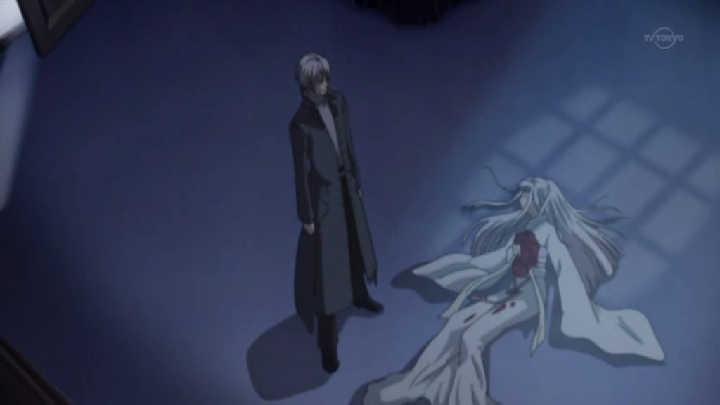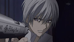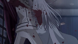 Having left the dance, Yuuki heads straight to Maria in order to offer herself in exchange for the way to save Zero. Having possessed Maria, Shizuka doesn’t like it when Yuuki talks about saving Zero because Shizuka was the person who gave him despair in the first place. Nevertheless, when Ichiru brings her real body to her and lets her reawaken it, Shizuka still explains to Yuuki that all Zero has to do to survive is to drink her blood. With the real Shizuka awake now, she gives up Maria’s body, and Ichiru carries it away. Shizuka then goes for Yuuki’s neck, but before she can bite down, Zero interrupts them. To his surprise, Yuuki actually protects Shizuka and cites how only Shizuka can save him. Zero, however, quickly points out that he could drink Shizuka’s blood after half killing her. When Yuuki reluctantly decides to use her bracelet on him, Zero grabs her arm to stop her but quickly notices that she’s in tears. Before Zero can do anything else, Shizuka exercises her vampire power over him and has him hold Yuuki. She first drinks from Zero’s neck, but when she leans in to drink from Yuuki’s neck too, Zero is able to resist her command and grabs Shizuka by the throat. As he struggles with her control over him, he shoots himself in the leg before turning his gun and shooting her three times in the chest. Though bleeding, Shizuka just laughs and blocks the rest of his shots with her clothing.