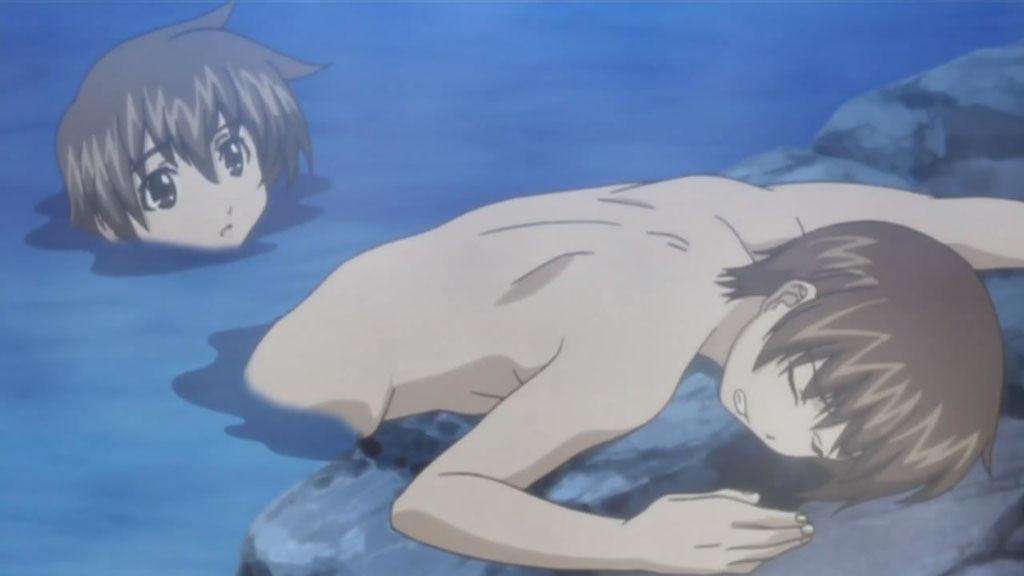 The others then play badminton with the girl using old-fashioned hagoita (羽子板) rackets, before finally taking a dip in the hot spring, where Noboru still can’t quite relax thanks to Kou.