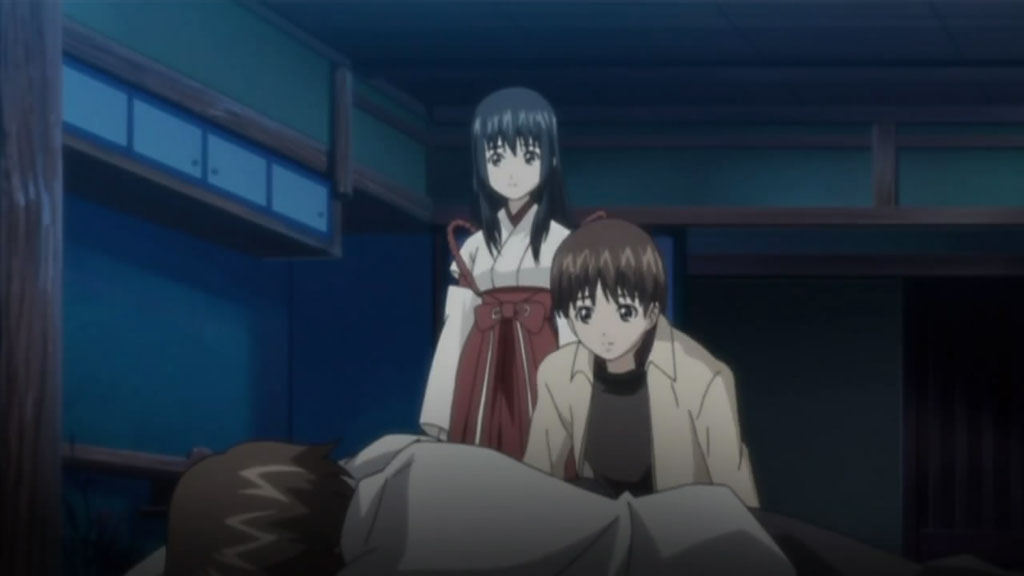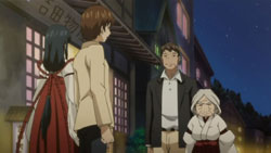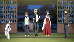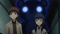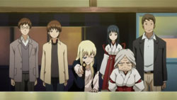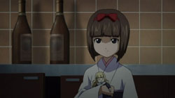 While the others enjoy their time outside, Kou soon realizes that there’s no one at the inn to protect Tooru, so everyone rushes back. There, they find several seemingly harmless ghostly apparitions around and Kuugen eventually finds the girl who’s responsible; however, upon threatening her for her pranks, the girl cries. Noboru and Kou then find Tooru collapsed in a room, where Kuugen “convinces” the girl to return the spirit energy that she absorbed from him. Kuugen then explains that she’s a Zashiki Warashi (座敷童), a protective household deity, and gets the girl to apologize for using Tooru’s energy to play with. As Oobaba-sama walks off, Noboru chases after her, saying that there’s nothing to worry about since Kuugen and Kou are protecting them properly.