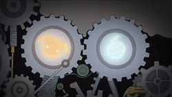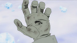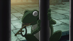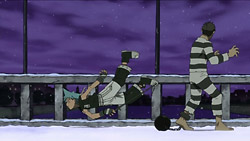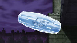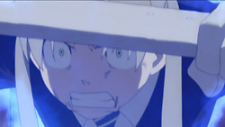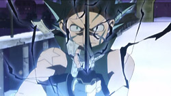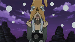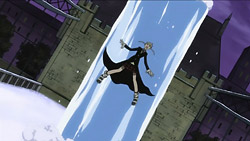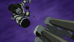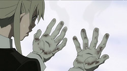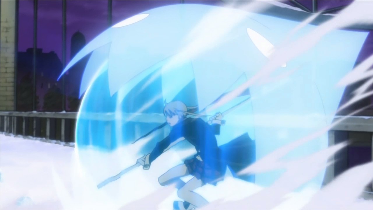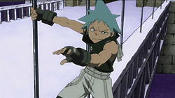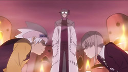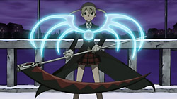 Believing that the battle isn’t over yet, Free tries to create a block of ice in mid-air so that he can use it as a springboard back onto the bridge, but he accidentally materializes the ice over his own body, causing him to fall and sink into the water below. Medusa is pleased with what she’s seen though, and she’s now convinced that moving forward with the black blood research will lead to the evolution of a Kishin. In the aftermath of the battle, Soul and Maka make up, but she then starts coughing up black blood.