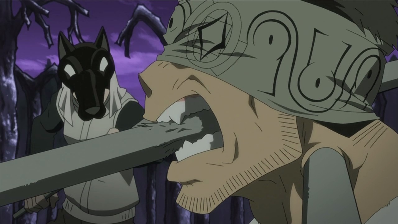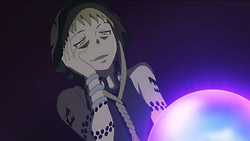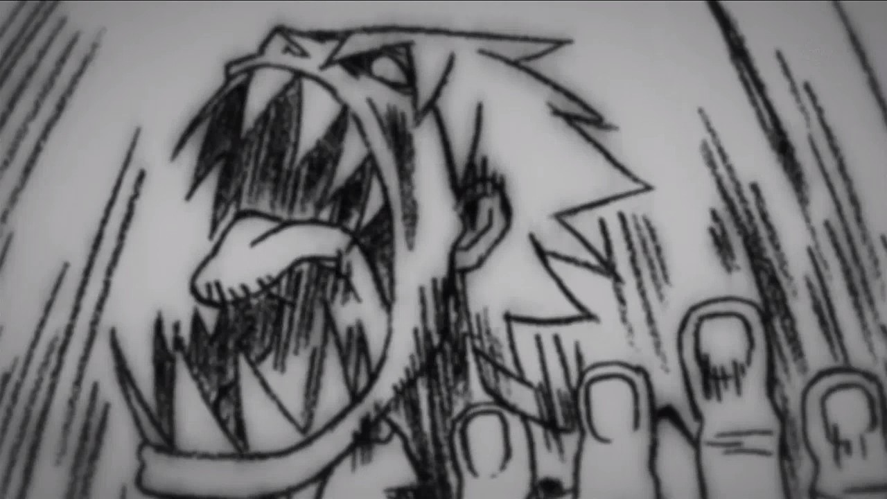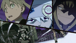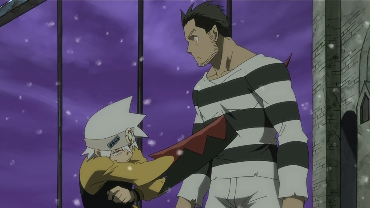 With the key provided by Medusa, Eruka manages to free the man with the demon eye and learns that he had wanted to escape by digging tunnel with a spoon. Unfortunately, his plan was foiled because every meal was served with chopsticks. When Eruka suggests that he could have used urine to eventually corrode the iron bars, he gets so frustrated that he bangs his head against a tree. This gives enough time for their pursuers to catch up with them, but before he can resist them, they impale his face and neck multiple times. Eruka panics, but the man with the demon eye remains unfazed and reveals that it wasn’t that Mabaa imprisoned him without killing him – it was that she couldn’t kill him because he’s immortal. Maka and Soul meanwhile have gone to Stein for some extremely dangerous training – if they fail, their soul wavelengths might never match each other’s again. The two are surprised, however, when the training turns out to involve them talking about each other’s faults, and when Soul doesn’t hesitate to start listing off negative stuff about Maka, she gets angry and hits him. What the two don’t realize is that Stein is intentionally aggravating them with the smell of the special candles in the room, and he feels that if they can get past this, then their soul wavelengths will resonate more strongly than before. The problem is that Maka and Soul have come to an impasse over how she wants to become stronger to protect him instead of just fighting to make him stronger.
