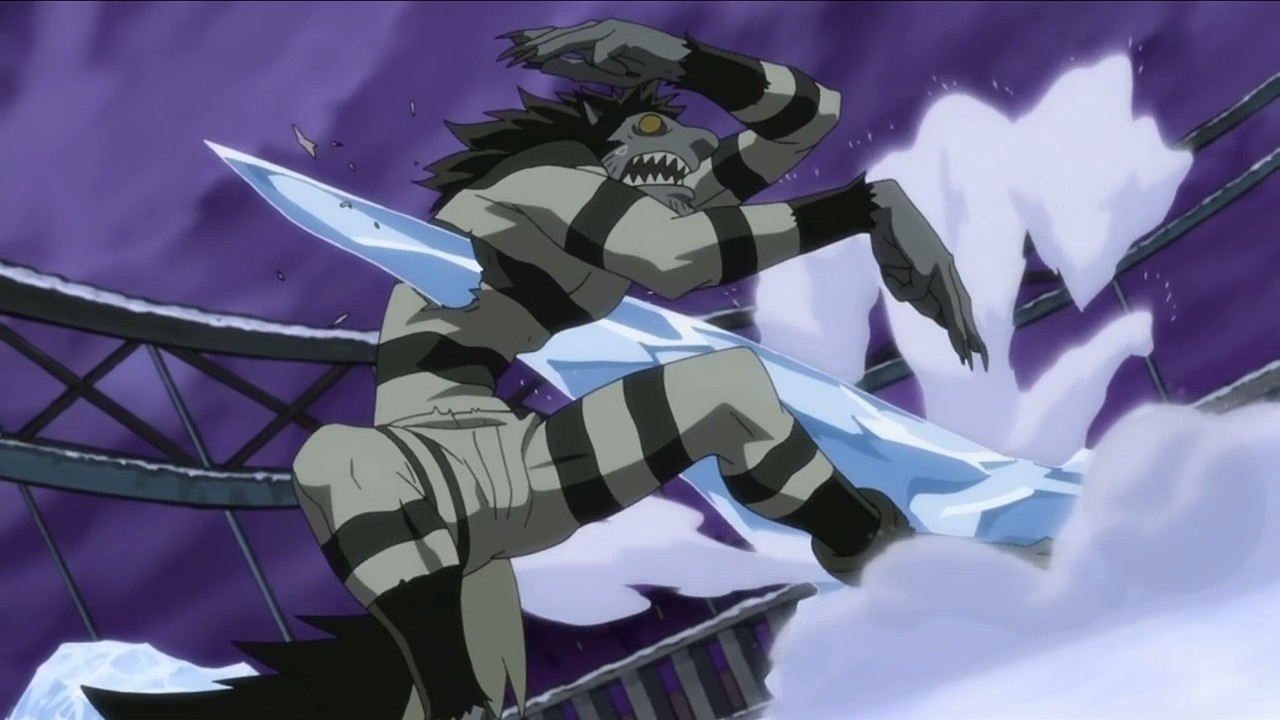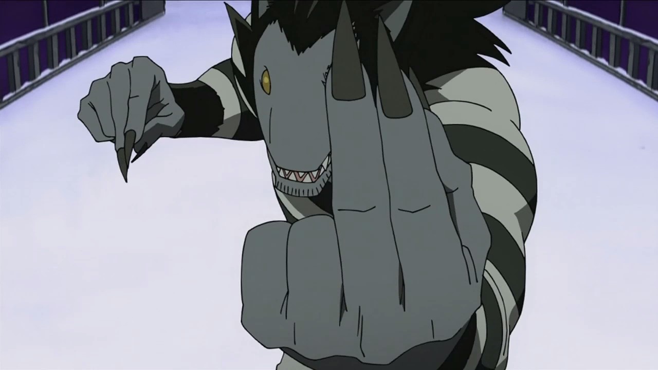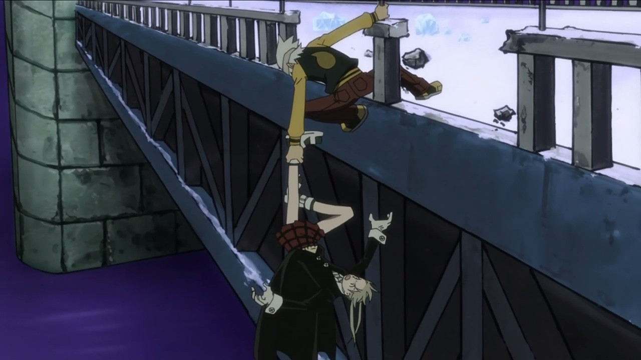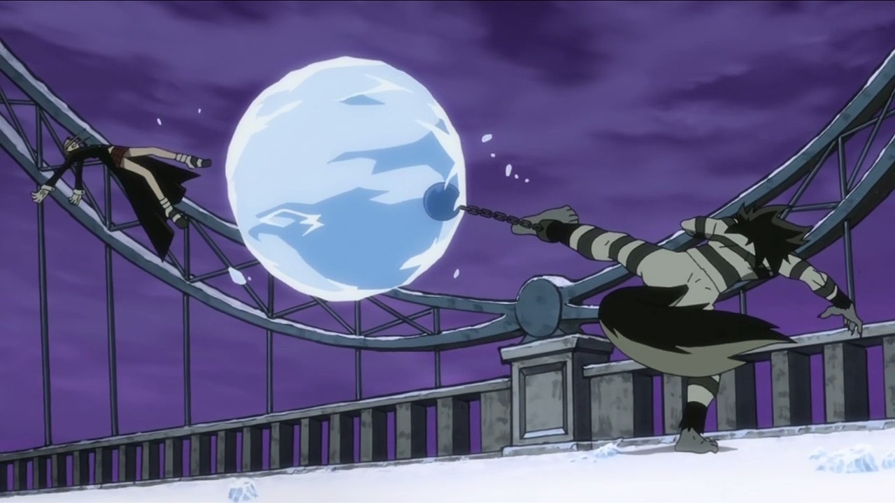 Not giving Maka much time to react, Free begins to smack her around with his brute force and ice-based abilities. It culminates in him attempting to use his Demon Eye Cannon ability on her, but he screws up and accidentally impales himself instead. His immortality allows him to recover almost instantly though, and after he nails Maka with a giant ball of ice, she decides to wield Soul even when their wavelengths don’t match. Soul, however, becomes frustrated watching her get knocked around, and the two start arguing mid-battle about her wanting to get stronger. It is ultimately Tsubaki who steps in to lecture the two for not considering each other’s views and about being so angry. This leads to Maka deciding that she wants to become stronger with Soul, and Soul in turn opts to become stronger by finally approaching the small demon in his mind and taking him up on the offer. Maka and Soul then initiate a resonance of souls, and Soul nearly loses control, much to the joy of Medusa who is watching the battle. He manages to reel himself in though, and the two form the Witch Hunter blade. Free attempts to defend himself by using his tail as a wall, and though it initially stops Maka, she feverishly headbutts the shaft of her weapon until it finally cuts through. In the heat of the battle, she then throws herself at Free to push him off the side of the bridge. Soul manages to grab her arm to keep her from falling, but Free latches onto Maka with his claws, and she’s unable to get out of his grasp. It’s not until Black*Star uses Tsubaki to sever Free’s arm that Maka gets free.