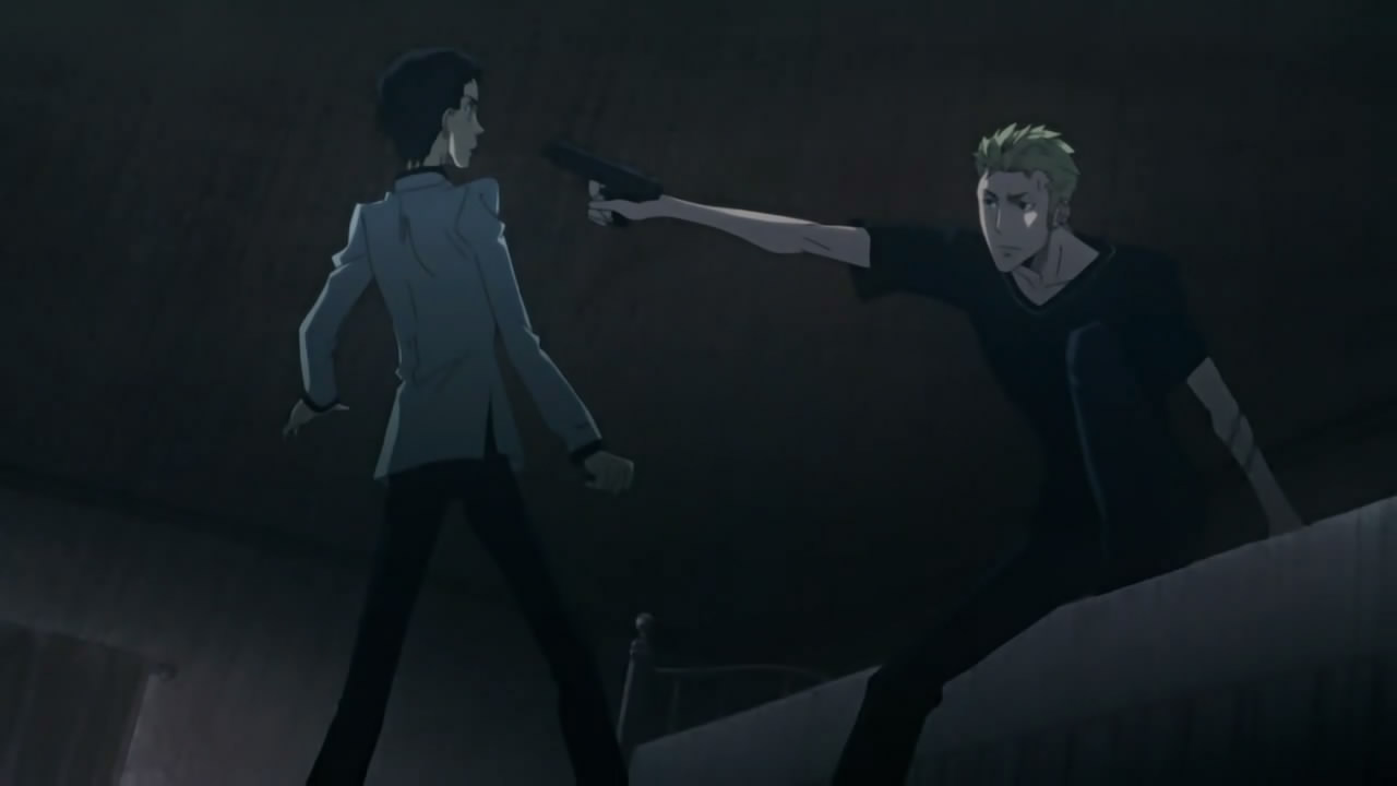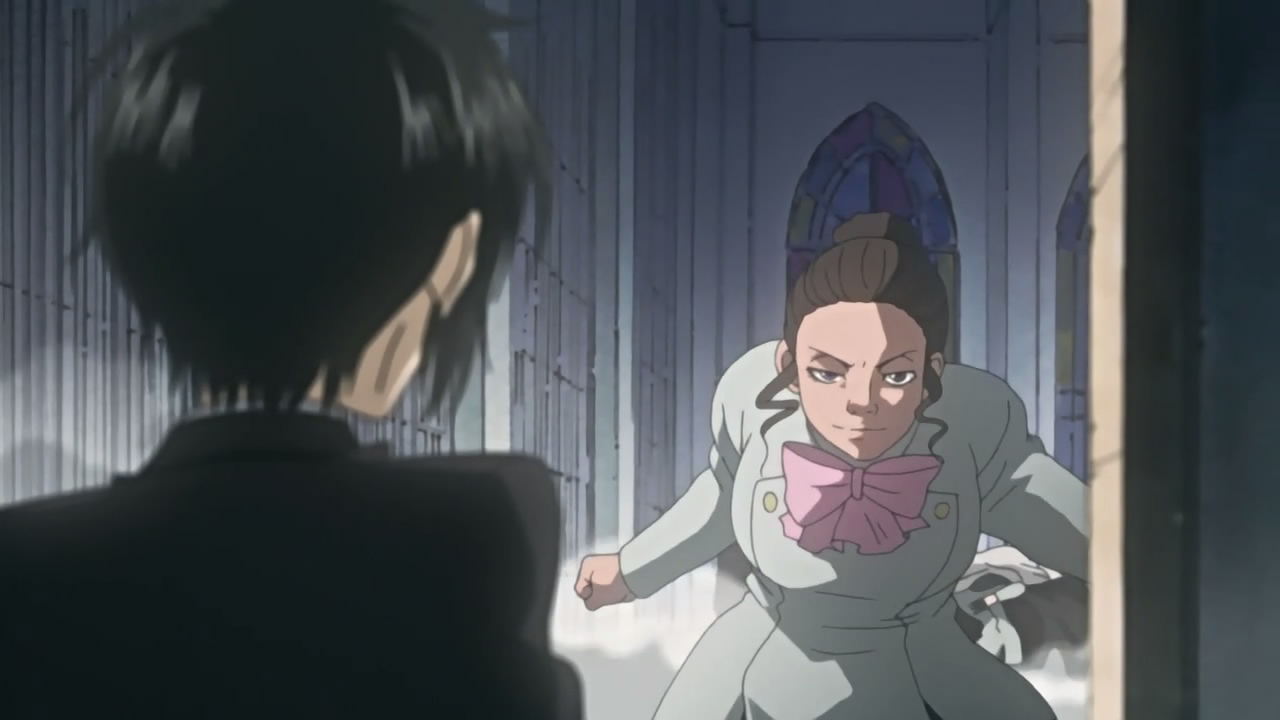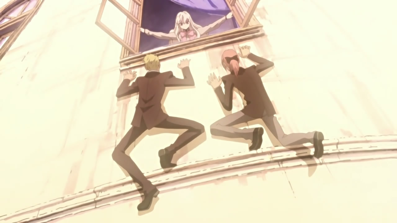 Shortly after, Kurookano Shijima comes along and offers to guide them to Kouga’s village, which happens to be an elevator/escalator school named Alya Academy on the surface world. After showing them to their rooms, Shijima tells them to rest until an announcement is made for the meeting; however, Yoite wants to act on his own and snatch the kinjutsusho. Yukimi manages to stop him though, after some heated discussion about having a plan and not wanting to kill kids. Looking out the window, Yukimi notices Thobari in the adjacent room and finds this suddenly very interesting, whereas Thobari finds this suddenly very complicated.