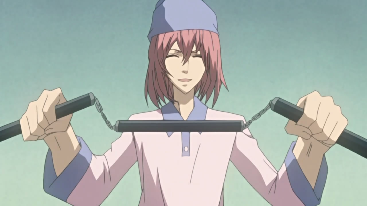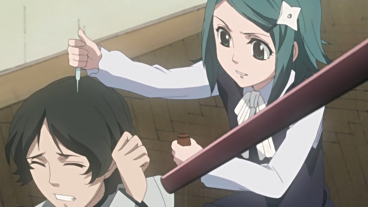 Yukimi put it best when he said, “For now, we’re on standby until the replacement car for the one Raikou destroyed with his ‘super driving tech(nique)‘ arrives.” Raikou did return the favour to Yukimi at Alya Academy though, when he made him the “baka character” by telling him you don’t buy ballpoint pens from a wall. Speaking of Raikou, I guess he gave up his Shirogamon for a sansetsukon (三節棍), i.e. three-sectioned staff. As for Thobari and Hana, I’m not quite sure how much history they have, but given this scene and the similar one in the ED sequence, I guess there’s much more than we’ve been let on.