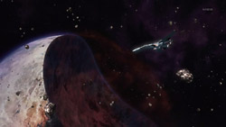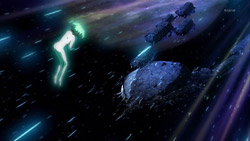 Alto manages to escape from the expanding Fold dislocation bubble, and when he looks back again at Gallia 4, he sees that there’s now a huge chunk missing. Over on the Macross Frontier, Ranka’s manager has to reassure people that Ranka will be there for the concert today. Nanase is worried for her friend and becomes even more so when Luca fills her in on what happened. Ozma meanwhile remembers how he had tried to stop Ranka from going to Gallia 4, but at the time, she had pointed out how he had often said that it’s better to take a chance than regret it. Her determination causes Ozma to realize that Ranka had grown into a woman while he wasn’t paying attention. On the bridge of the Macross Quarter, the girls are chatting about love and relationships when suddenly the Vajra fleet de-folds nearby. The Macross Frontier fleet immediately begins locking down the habitat ships and evacuating everyone into shelters, and since Luca has to join his squad, he leaves Nanase with the promise that he has something to tell her when he returns.