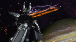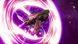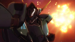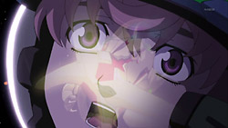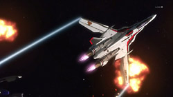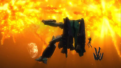 In advance of the battle, the Macross Quarter transforms and takes its position as part of a defensive front protecting the Frontier fleet. They get to fire the first salvo and soon engage the enemy. Unbeknownst to their friends, Sheryl and Mikhail’s Valkyrie is holding on to one of the Vajra capital ships, and when Sheryl wakes up, she finds the battle already started and Mikhail still unconscious. Confident that she can pilot the craft based on what she remembers from her lessons, Sheryl takes control of the Valkyrie, but she immediately nicks the side of the Vajra ship and then lets the Valkyrie get shot by Vajra fighters. The emergency eject activates right before the Valkyrie blows up, and Luca tries to come to their rescue after having seen them. Unfortunately, the Vajra shoot and destroy Luca’s Valkyrie’s rifle, leaving him and Sheryl defenseless. Their savior ends up being none other than Alto who had just arrived on the scene after using the special Fold pack that Mikhail had left in orbit around Gallia 4. Alto quickly takes care of the smaller Vajra and brings Sheryl back to the Macross Quarter.