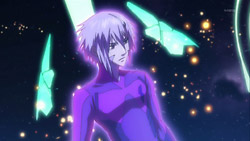 Around this same time, a second Vajra fleet – this one including the mother ship that is holding Ranka – suddenly de-folds behind the Frontier fleet. This fleet’s first volley blows a hole into the main habitat ship, and inside the Frontier’s command room, Leon convinces Howard Glass to authorize the use of reaction weapons against the Vajra. The Macross Quarter turns to face the new threat, but Alto stops them from attacking immediately because Ranka is inside the enemy mother ship. Alto wants permission to go rescue her, so Jeffrey grants him use of an armor pack and some reactive warheads. While Alto’s Valkyrie is being outfitted, Sheryl approaches him and tries to make him promise to come back unharmed. Alto instead promises to bring Ranka back and launches in his Valkyrie before Sheryl can say anything else. The four reactive warheads Alto shoots take care of much of the initial wave of Vajra coming at him, and when Ranka sees what’s going on from inside the Vajra mother ship, she wants all the fighting to stop. Suddenly, she sees a vision of a long-haired woman saying that her kind want to tell Ranka’s kind something, and the woman then starts to sing Aimo.