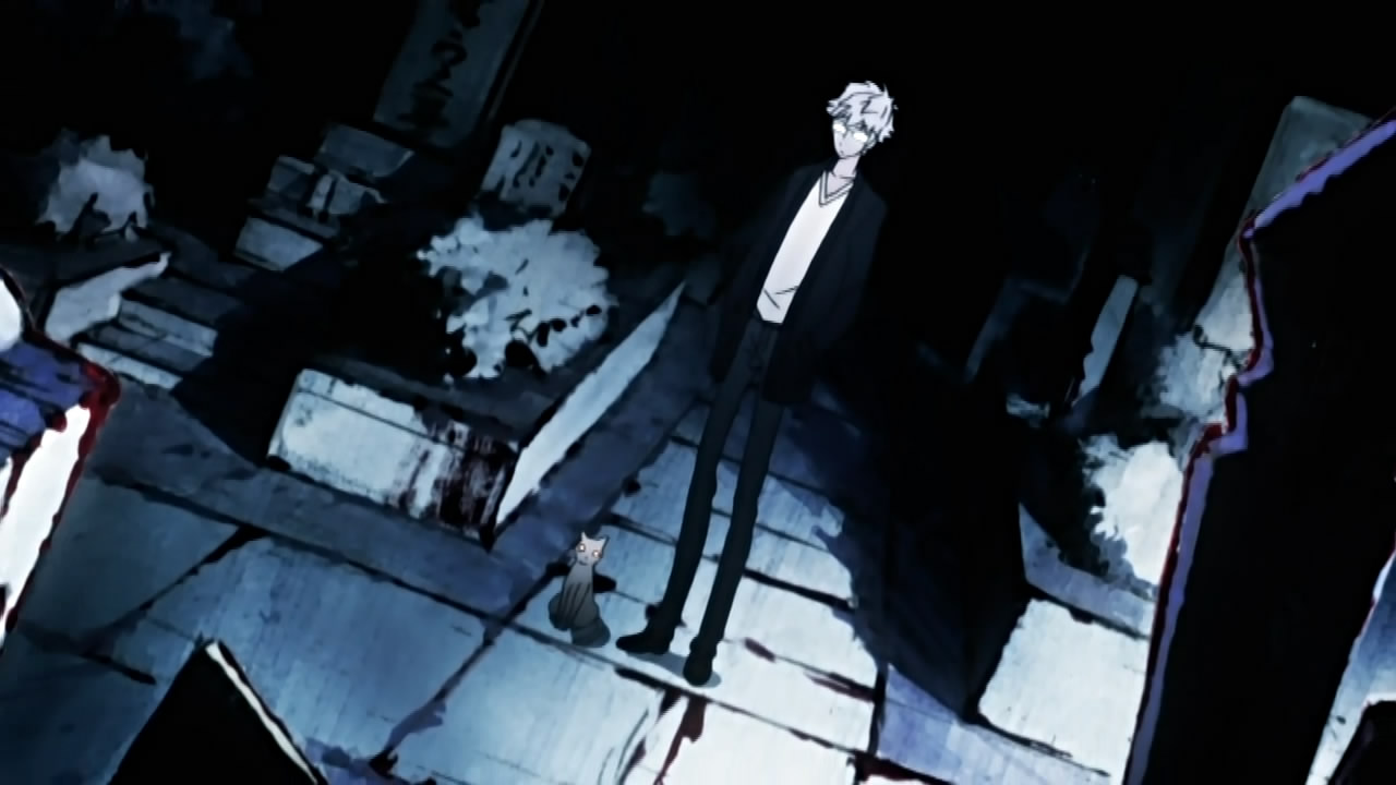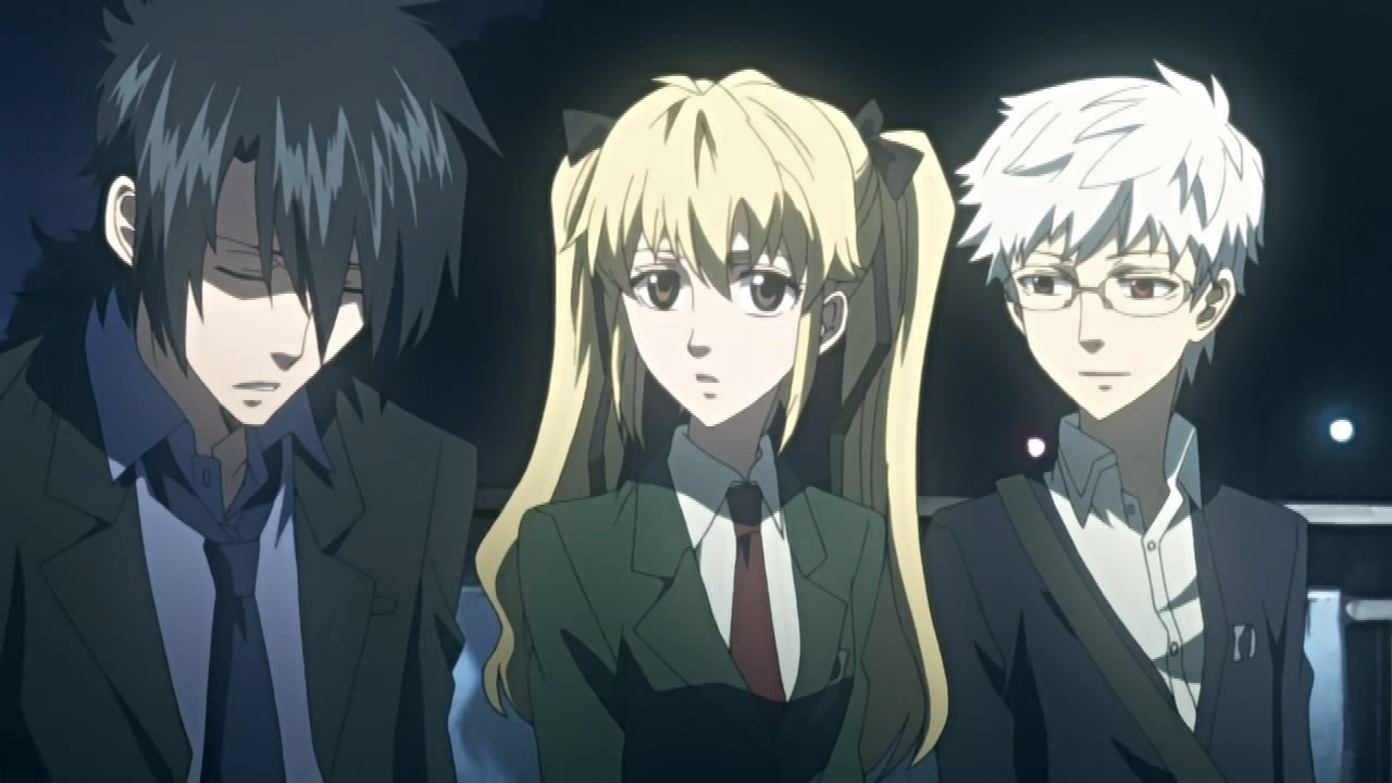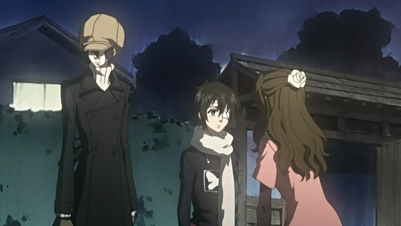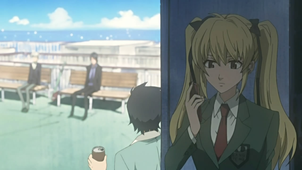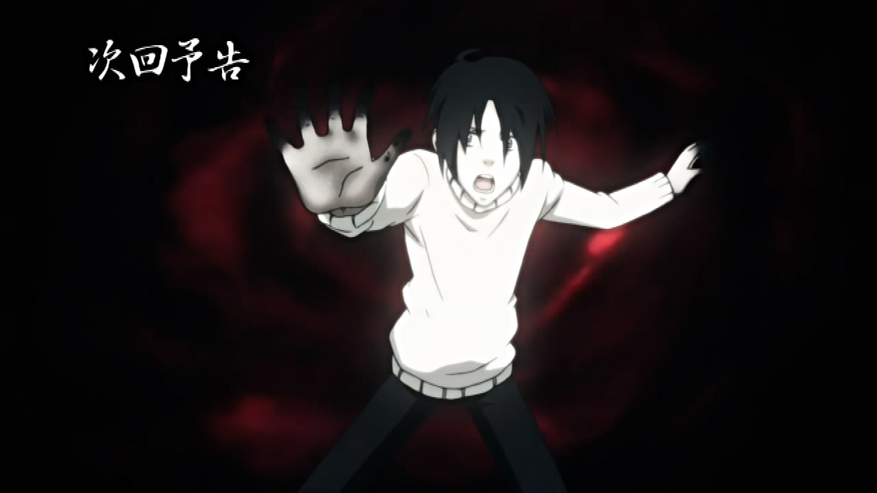 Elsewhere, Kouichi and Raimei managed to drag Kumohira onboard a ferry, where he apologize to Kouichi for getting him killed. As atonement, Kouichi inquires about what happened ten years ago, implying that Kumohira knew about the Shinrabanshou’s revival in Miharu long before anyone else, and was affected by its powers in a way he can’t talk about. Hearing this, Kumohira questions what Kouichi’s after and why he’s trying to dissolve his resolution. Kouichi simply reiterates his desire to use the Shinrabanshou to die though, but adds that he also wants the Shinrabanshou to be sealed away so that a monster like him is never created again. Realizing that this is contradictory, Kouichi tells Kumohira that what he does from here on is dependent on him. Meanwhile, the two of them are unaware that Raimei is trying to/has contacted Miharu.