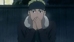 While Hana is cutting into a dessert, Yoite is reminded of a traumatic past with his step mother and runs outside. Smelling his scarf, Miharu is reminded of his own mother in a more pleasant memory. The doorbell then rings, so Hana gets the door, only to find that it’s Yukimi and not Thobari.