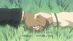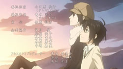New ending theme this week, by a female duo known as Anam & Maki. Can’t say I’ve heard heard any of their songs before, but I really like the strings and acoustics to this song. Compared to ELISA’s HIKARI (which I really liked), this is a lot more mellow and laid back. My only concern right now is the ending sequence itself, especially the part on the green field, which is undoubtedly going to have the yaoi sensitive viewers heading for the hills. Personally though, until I see anything remotely sexual in nature between Miharu and Yoite, it’s male yuujou (友情, friendship) in my books.