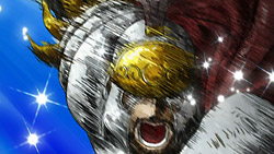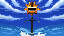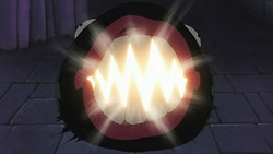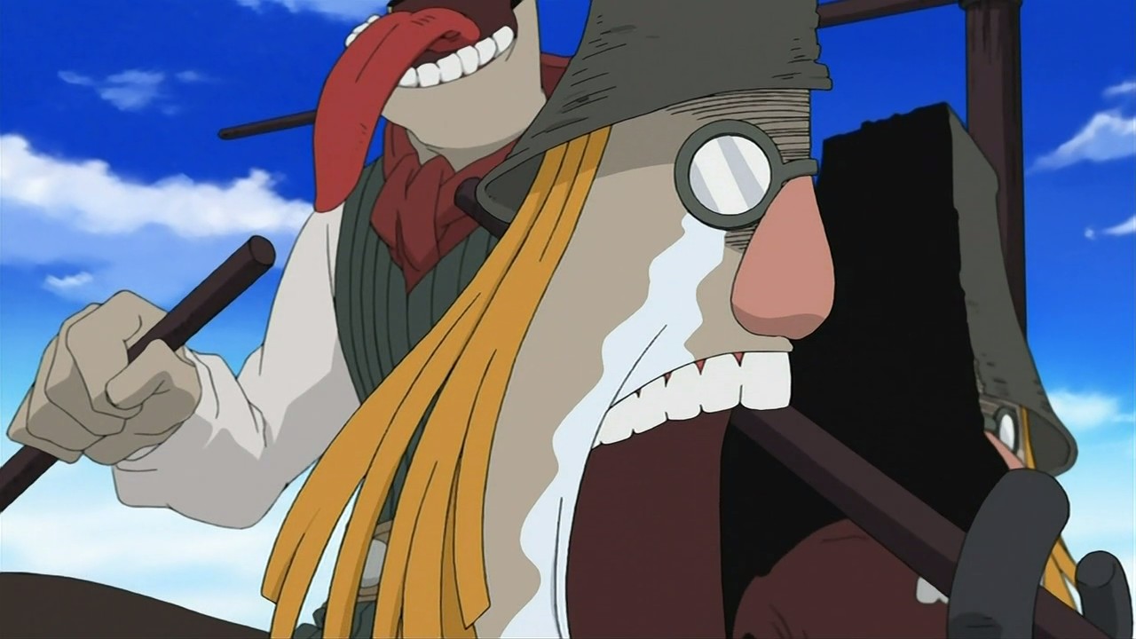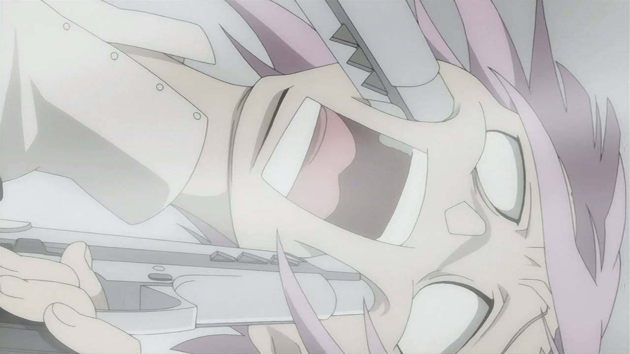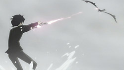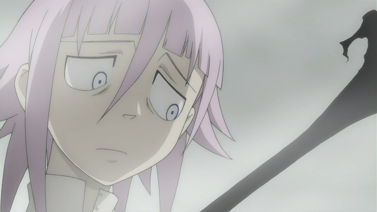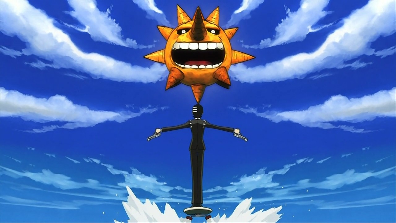 Death the Kid wastes no time in starting his attack on Chrona, shooting her multiple times at close range. It doesn’t do much damage to Chrona though, and Liz observes that Chrona’s attitude towards fear is kind of like how the sisters were before they joined Kid. The fight gets interrupted when the captain of the Nidhogg – who, despite being a severed head, is still alive – fires the ship’s cannons at the two combatants. The cannonballs and subsequent explosions have no effect on either Chrona or Kid, however Rangarok’s soul wavelength begins to swell up afterwards. Letting out a sreech to match Rangarok’s, Chrona uses a single powerful slash to cut the ship and its captain in half. As the ship starts to sink, Chrona and Ragnarok make their escape, and Kid tries to give chase. Unfortunately, he’s distracted by the fog clearing up and the emergence of a perfectly symmetrical sun and sky, and so Chrona and Ragnarok are able to get away.