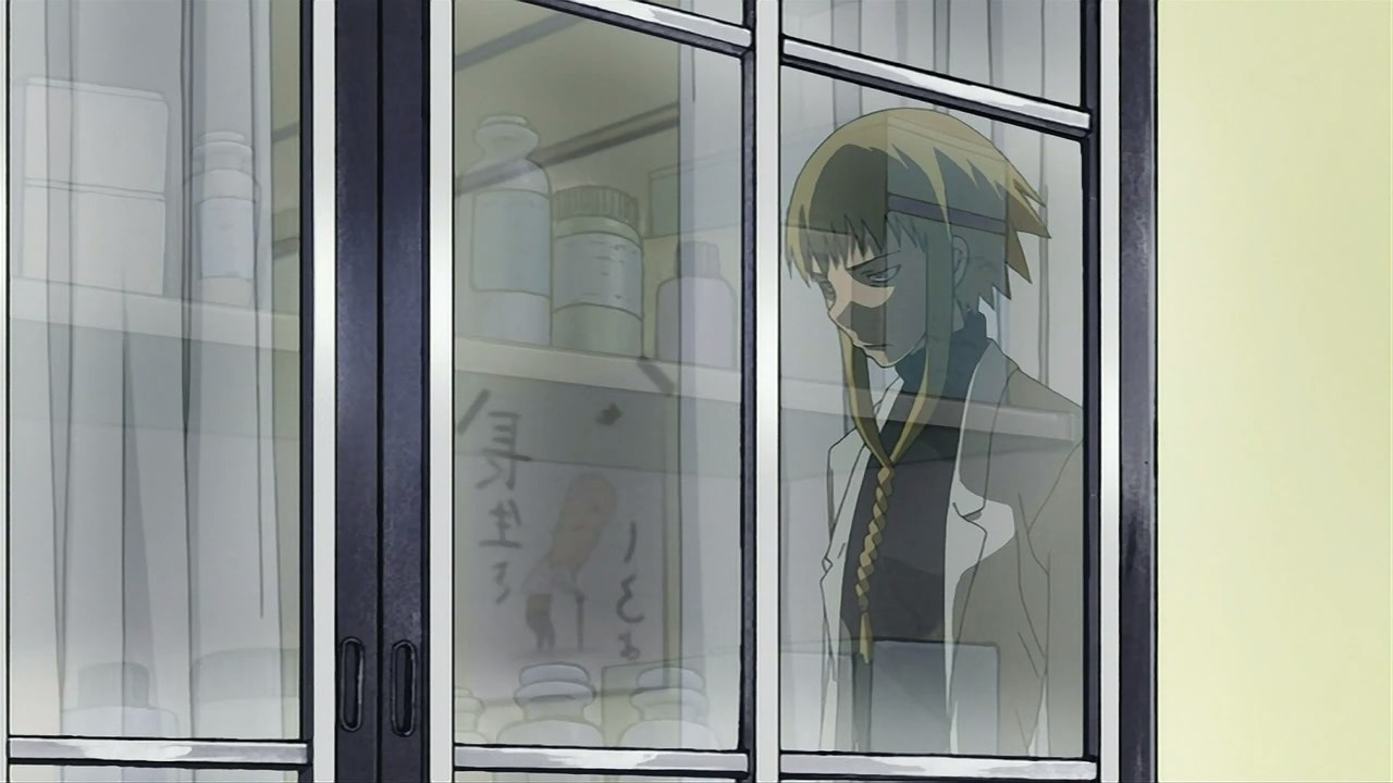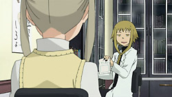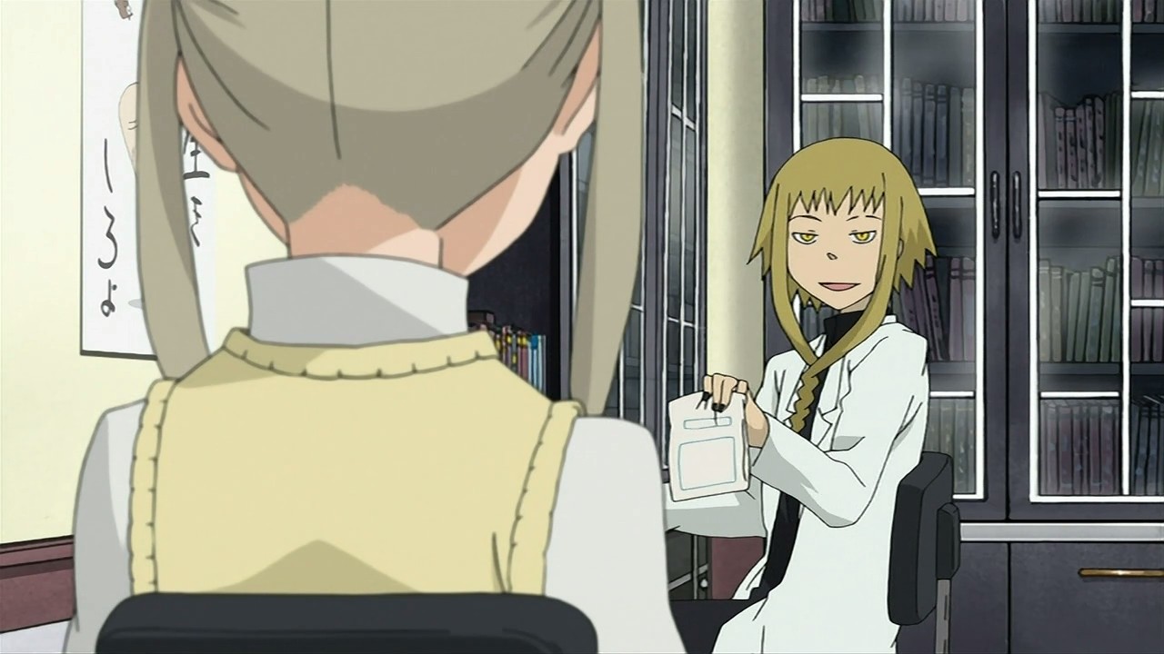 Back at Shibusen, Medusa reports to Maka that her blood test came back normal. Medusa herself finds the lack of black blood odd because she had herself been watching when Maka had coughed up the blood during the last battle. Nevertheless, she gives Maka some bad medicine that will speed up the effects of the black blood and reveals to Maka that Soul had came to her about his dreams. This makes Maka angry because he hadn’t told her about it. After Maka leaves, Medusa tries to find the girl’s file so that she can figure out why the black blood is gone. That file is missing from her cabinet because Stein has it, and he suddenly appears behind Medusa and asks her about her interest in Maka and Soul. Stein also has a prescription that Medusa wrote for Maka for a medicine that he’s never seen before, but Medusa keeps up the good-nurse act and claims that it’s of the herbal variety. When Stein wonders aloud if her interest in such medicines is as a doctor or a witch, Medusa stares daggers at him for a moment before returning to her normal demeanor again.