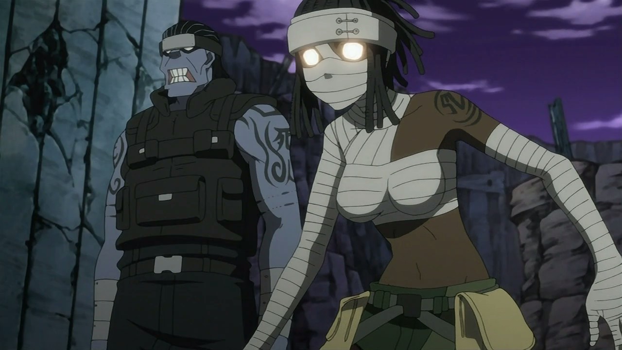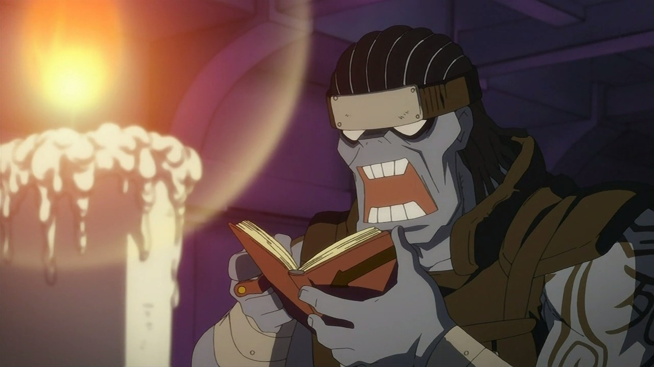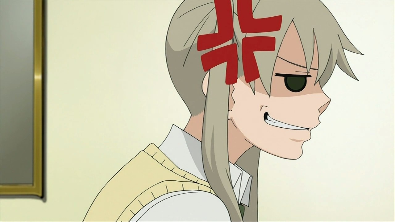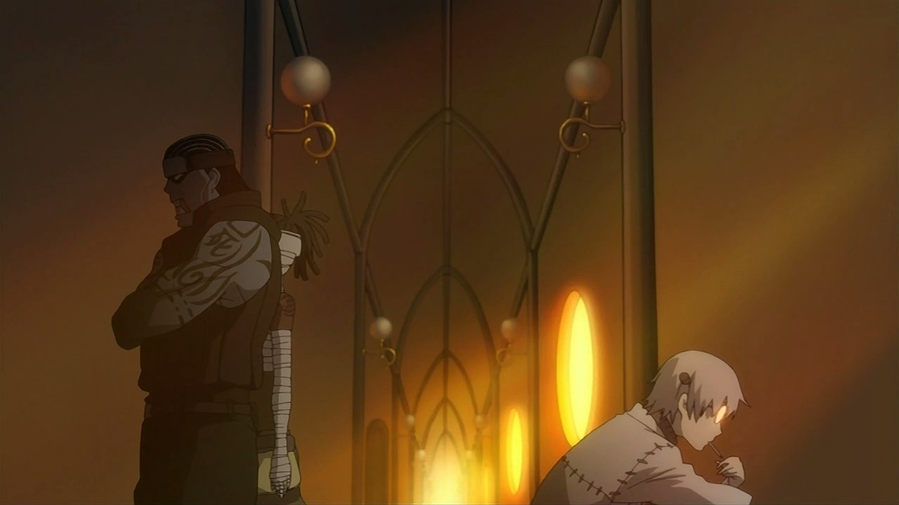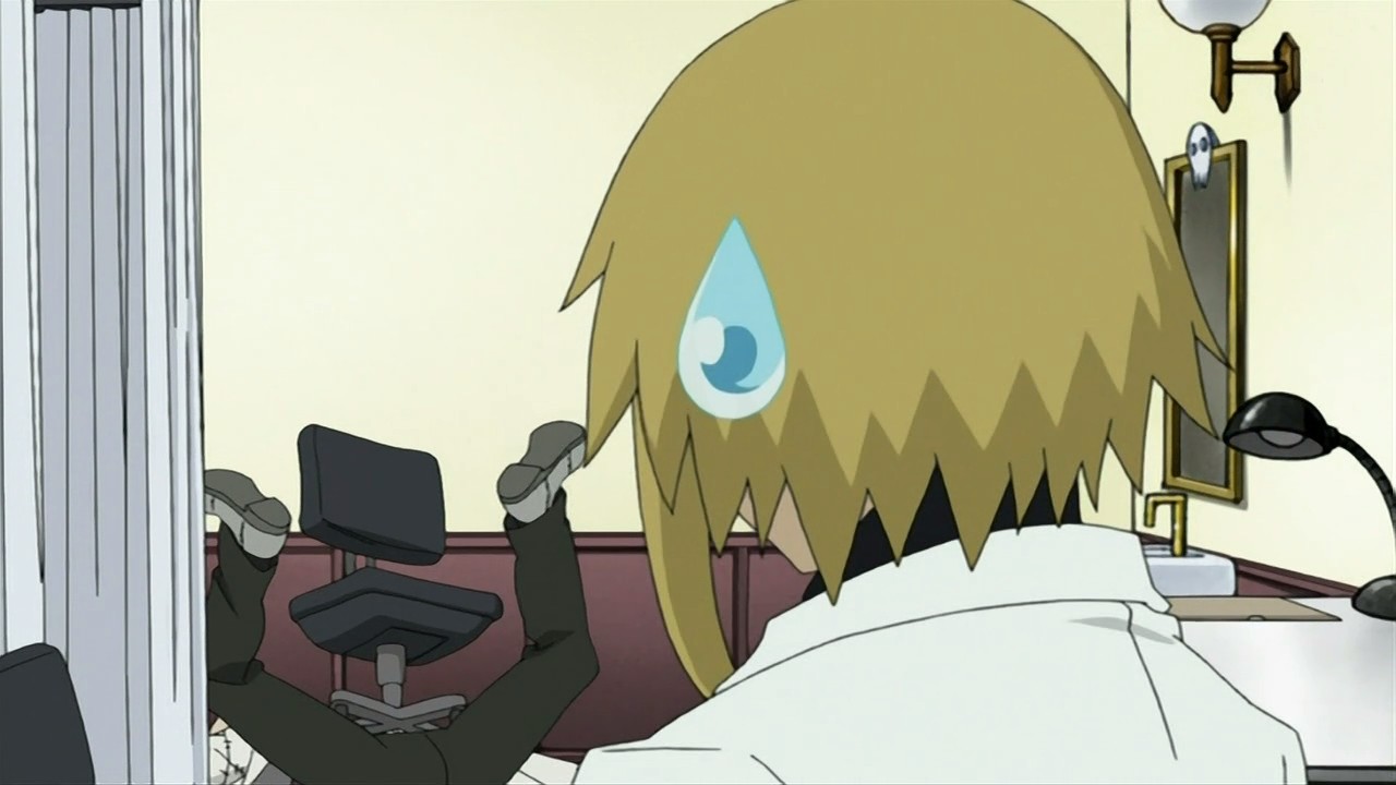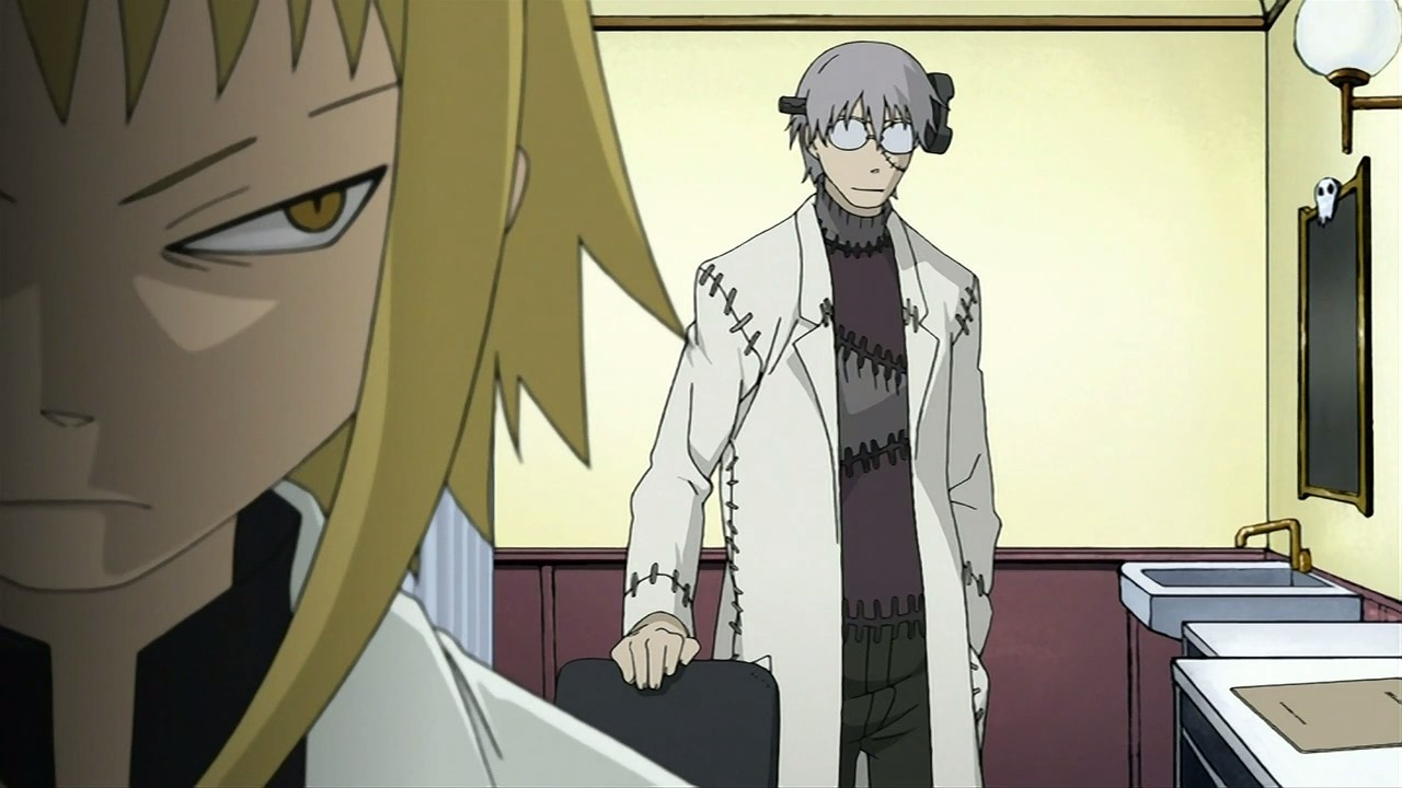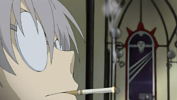 Stein then completely diffuses the situation by falling out of the chair, and after he leaves her office, he pauses for a smoke. He had noticed how she had looked like she wanted to kill him, and it had actually made him shake in fear. As for what to do about her, Stein lets Sid and Sid’s weapon Nygus go investigate her home first. Sid finds the place filled with experimental materials, and sitting right below a magic circle on her wall is a diary. Reading it reveals what Medusa has planned, and Sid realizes that Medusa might try something tomorrow on the eve of the festival. Before he can leave to bring this news to Stein and Shinigami-sama though, Stein gets blown up by some bombs set by Eruka. Meanwhile, Kid returns to Shibusen and goes to question his father about what the captain of the Nidhogg had said about the Kishin close to them. He suspects that it has something to do with how his father can’t leave Shibusen.