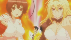 Comedy-wise, the endless struggle to be recognized as Minato’s “main” Sekirei continues to humour me, especially when Ku matches Musubi and Tsukiumi‘s quarreling. Kuno’s pretty funny to watch as well, seeing as she’s semi-unreliable, which is a characteristic that Haruka makes all the more apparent. As for Sekireis in general, I find that Uzume is the most attractive out of the bunch in her fighting form, which looks pretty damn cool when she releases a lot of Hire.
