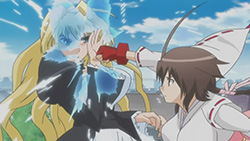 Overhearing how Tsukiumi plans to go after this disrespectful Sekirei, Kagari feels there’s need for him to appear as a guardian. On the Izumo Inn rooftop, Minato thinks that Musubi and Tsukiumi are against one another, but learns that they’re working together this time because of a secret between just them girls. Meanwhile, Haruka and Kuno are being pursued by Uzume and fail to get away, even with Kuno’s ability. Having heard the scream though, Musubi and Tsukiumi arrive to save them, introduce themselves, and ask Uzume for her number and name, unaware that it’s actually her. Tsukiumi accuses Uzume of being the Sekirei that they’re after, but Uzume simply thinks of how she doesn’t want to fight them yet. Kazehana then arrives in a drunken stupor and expresses how she doesn’t like the sight in front of her.