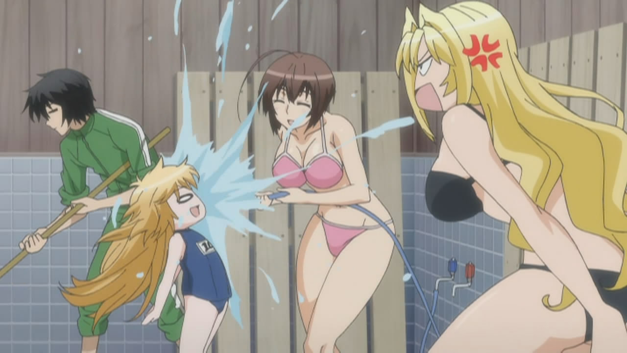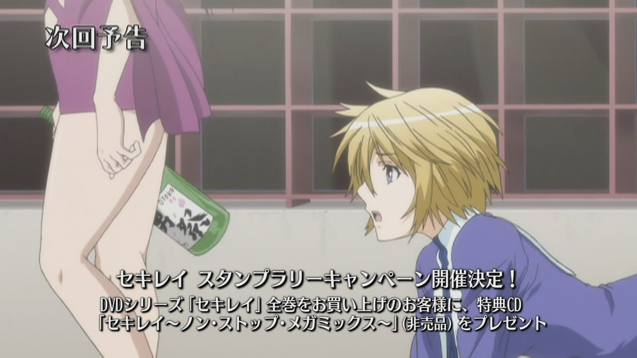 In an attempt to leave Shintou Teito, Shigi Haruka and his Sekirei, No.95 Kuno, try to slip past a M.B.I. checkpoint, but are intimidated by the Blue Sekirei of the Disciplinary Force, No.104 Haihane, forcing them to flee back into the city. Witnessing this from nearby, Homura gets the feeling that Hiroto is getting serious about his plans. At Izumo Inn, Minato and the others are cleaning the bathroom, where Musubi, Tsukiumi, and Ku continue to fight for Minato’s attention. After Miya accuses Minato of being a hentai, she tells everyone that it’s time for dinner, so Minato stops by Matsu’s room to let her know.