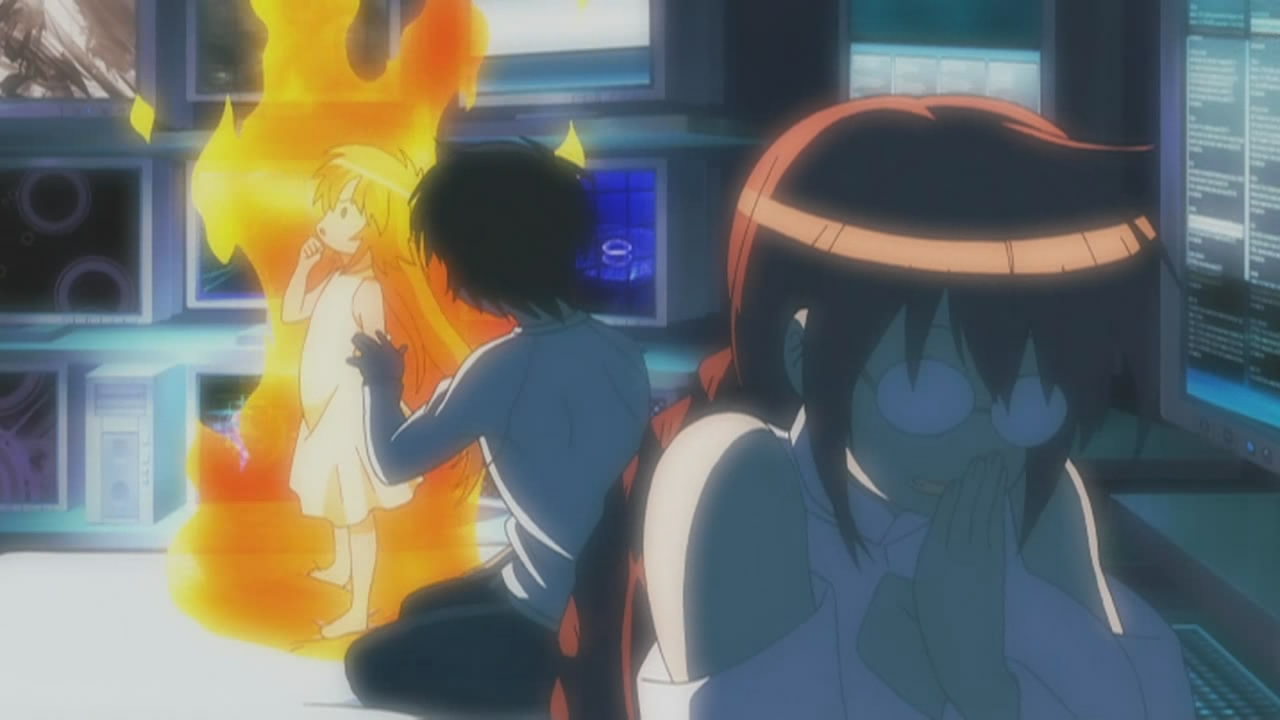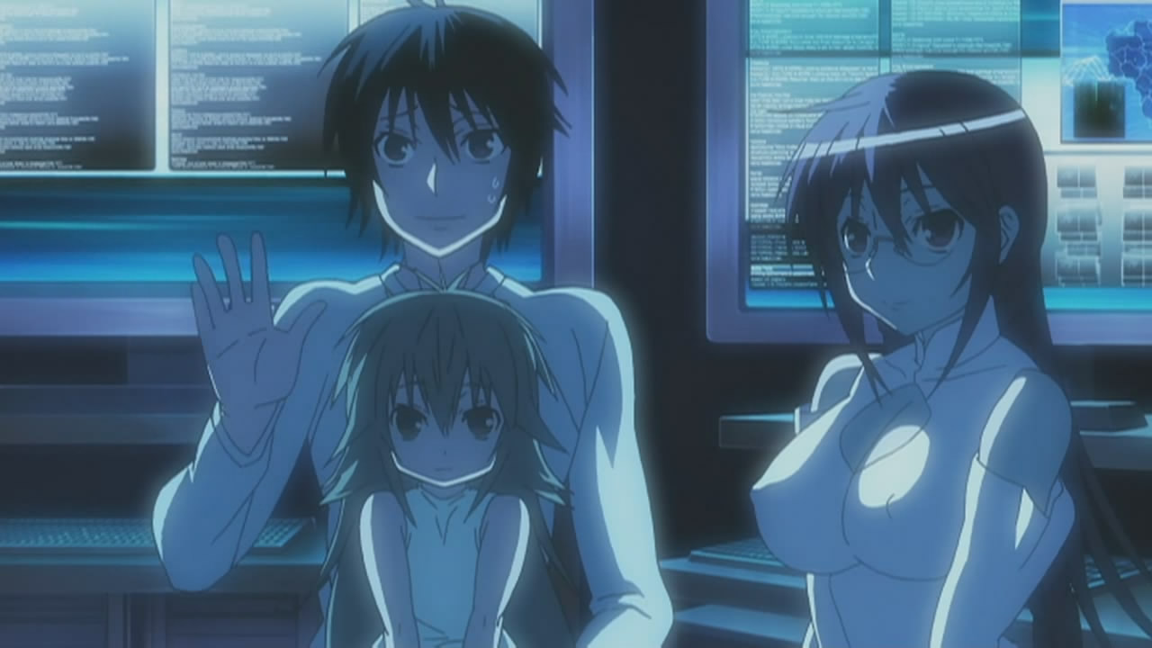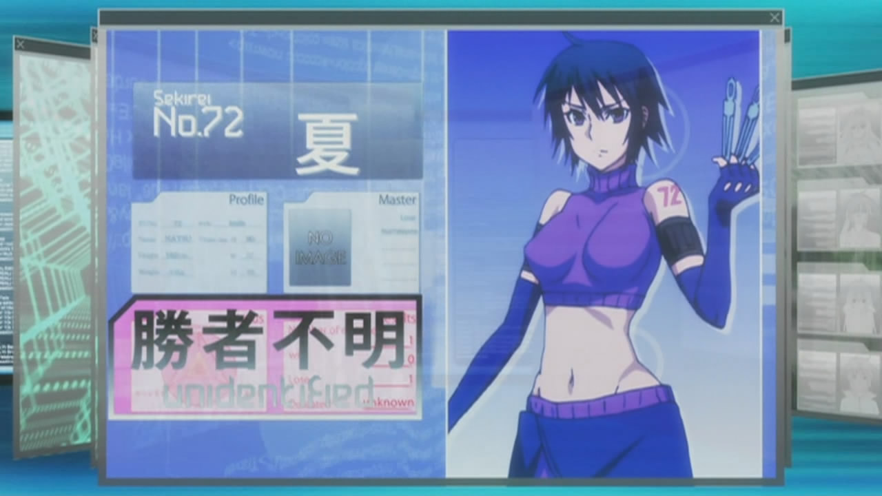 There, the cyberspace hacker Sekirei is browsing through the M.B.I.’s super top secret data bank and shows Minato and Ku the information they have on the current Ashikabi, the Sekirei with wings, and the defeated Sekirei. Matsu adds that she made a peculiar discovery though, where a couple of defeated Sekirei don’t have a victor listed. Explaining that there’s an unspoken rule of etiquette between Sekirei to guard a defeated opponent until the M.B.I. arrives, Matsu reveals that there’s a Sekirei leaving its defeated opponents on the verge of death after winning. Minato suspects that this is simply a lack of courtesy; however, Matsu says there’s importance behind letting the M.B.I. recognize the victors, so choosing not to is suspicious.