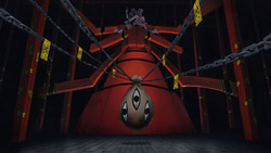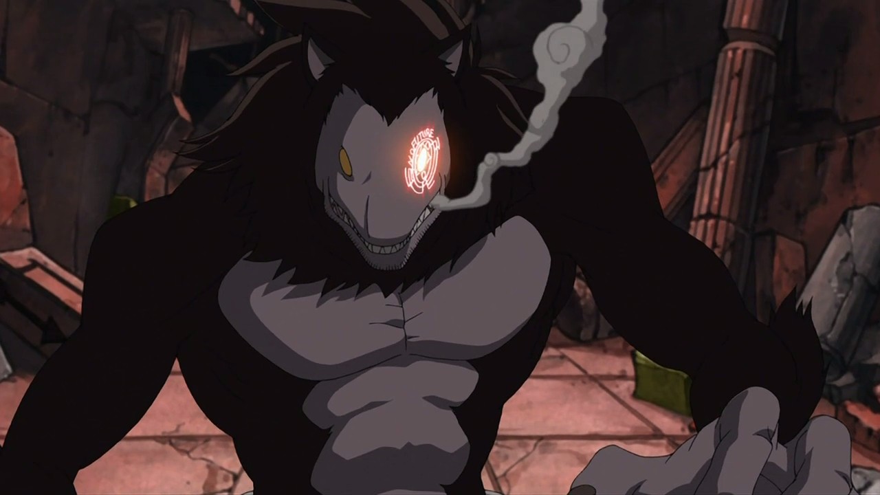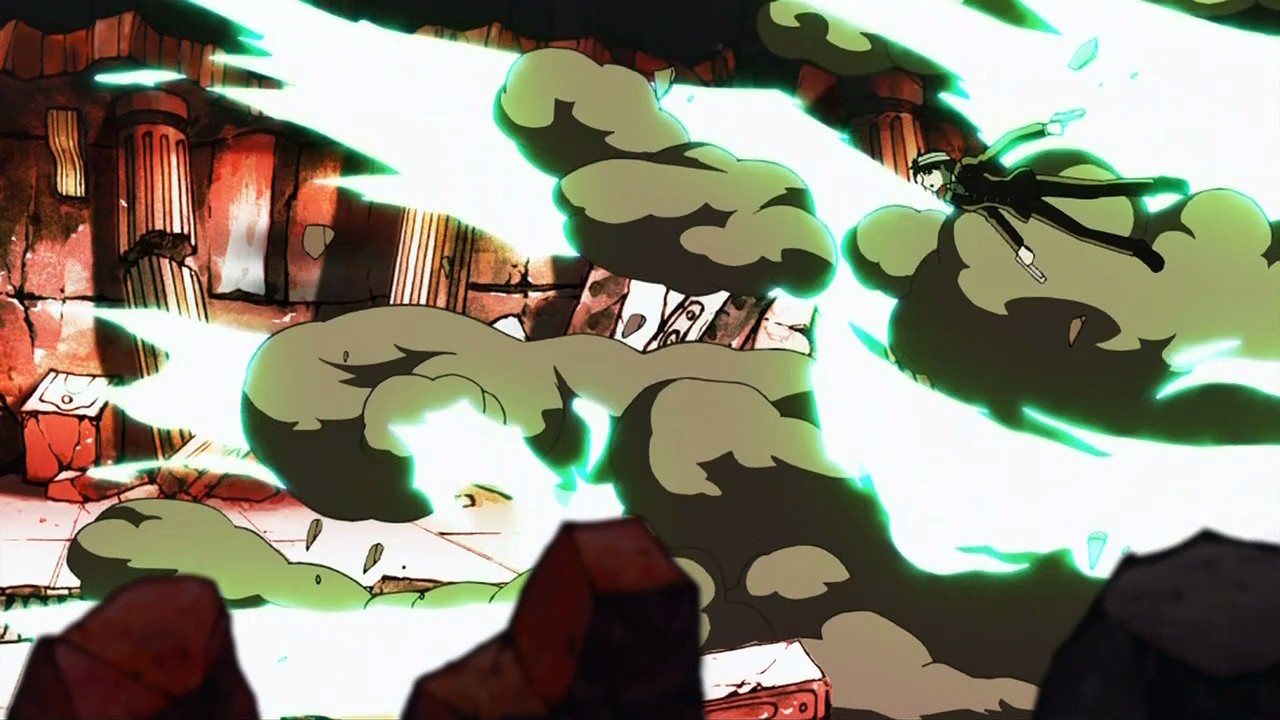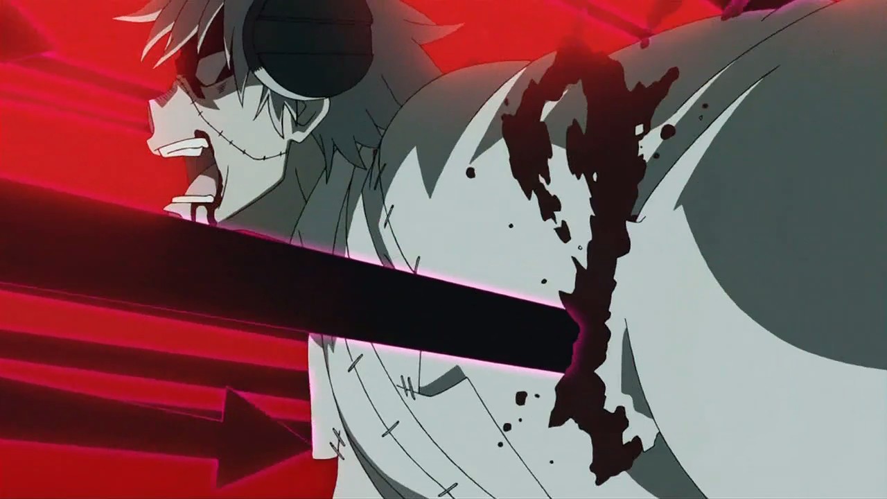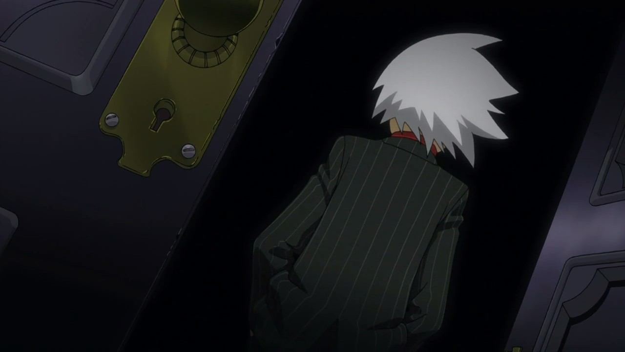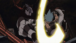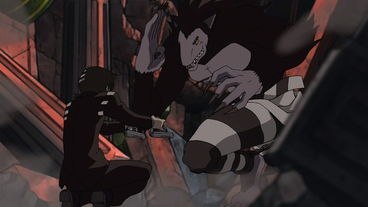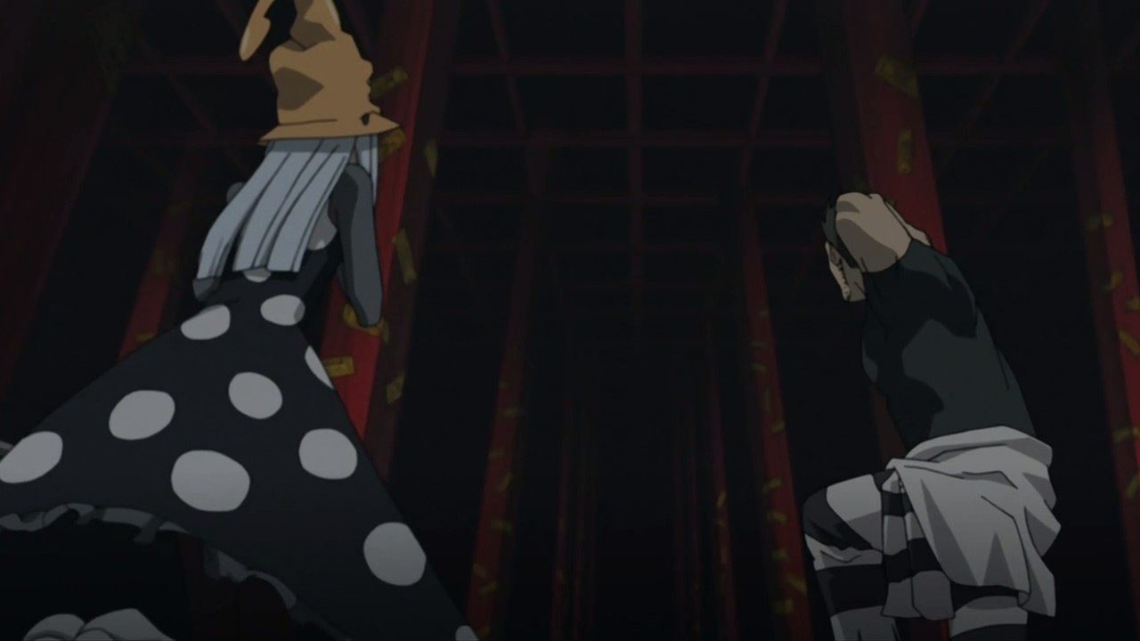 With Chrona still bawling, Maka is reluctant to leave her alone until Ragnarok appears and starts bullying her. Chrona gets Ragnarok to stop by punching him, but this only causes Ragnarok to turn his bullying back on Chrona. Since Chrona is handling Ragnarok, Maka and Soul are content with going on ahead. Much further down the tunnel, Kid is close enough to the Kishin that he can now feel its soul wavelength, and it nearly overwhelms him at first. He’s okay though and explains to Liz and Patty how his father had sealed Ashura in a bag made of Ashura’s own skin. Shinigami-sama had extracted all of Ashura’s blood before doing that, so Ashura’s body is starved for blood. Shortly after this explanation, Patty suddenly senses a heat source coming at them, and Kid just barely manages to get out of the way of the blast. The person responsible is Free, and Kid is forced to face off against the werewolf. However, even his Death Cannon attack has no effect on Free, and to make matters worse, Kid finds himself unable to concentrate on the task at hand.
