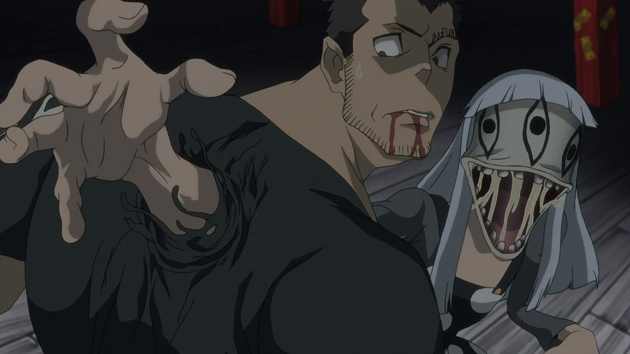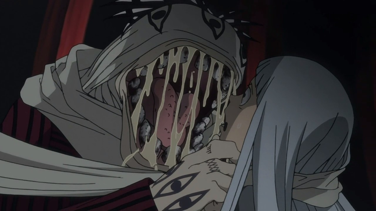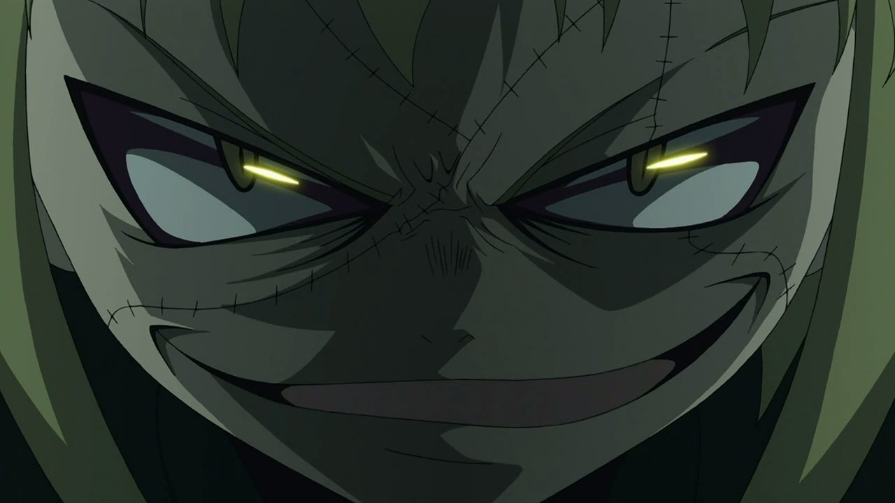 Fortunately, Black*Star catches up and literally knocks some sense into Kid. Black*Star quickly engages Free in close quarters combat, and while this is going on, Kid notices something strange: Free is trying to avoid Black*Star’s attacks whereas he didn’t make that effort moments ago. When Kid figures it out, he steps in between Black*Star and Free and proceeds to walk right through Free. Since the secret is out, Free reveals that this is a magic he’s using called Forwarding Vision which allows his image to be projected to a different place. The real Free is still with Eruka moving further down the tunnel towards the Kishin. Because of this, Black*Star and Kid continue their pursuit, but by this point, Eruka and Free have reached the shrine where the Kishin is being held. The inside of it creeps Eruka out, and she keeps thinking that there’s something moving behind her. It unnerves her, and when she turns around again, she finds Ashura in front of her. He rips off and consumes her face, and Free hears Eruka screaming behind him. When Free goes back to check on her, her face changes, and she drives her arm through Free’s chest before ripping the skin off Free’s neck and face.
