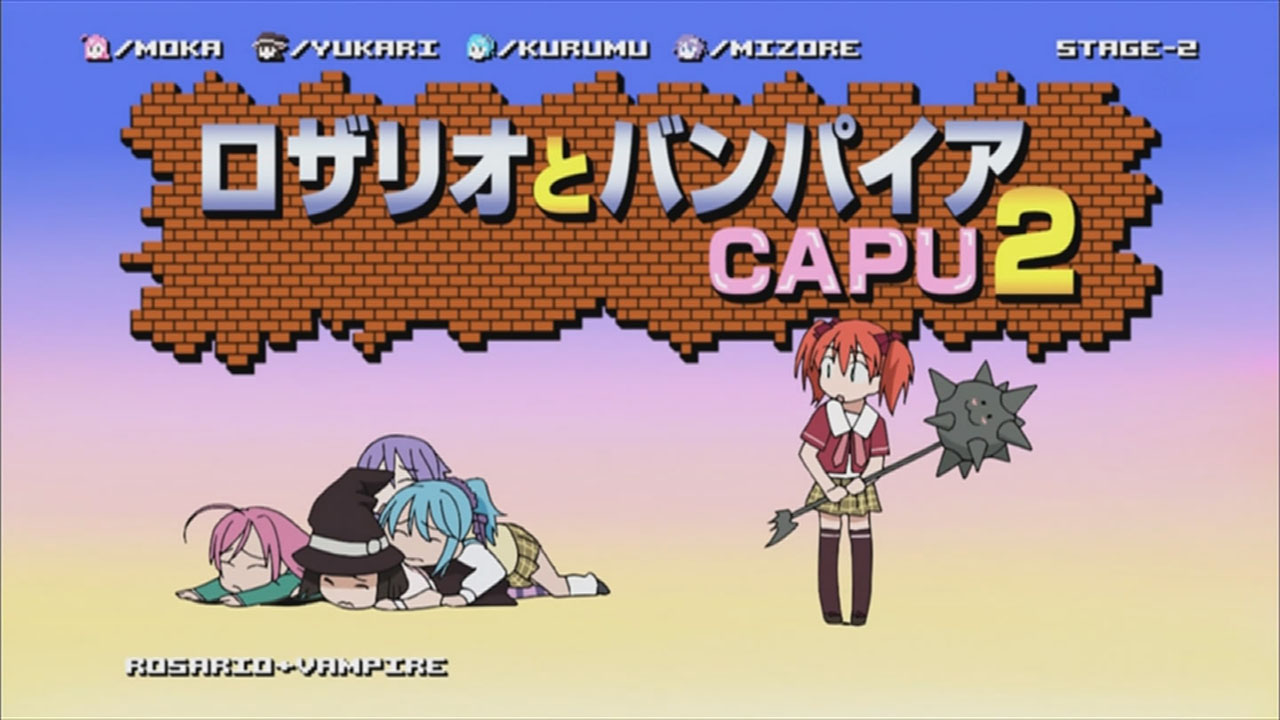 Prepare yourself for another season of Tsukune rosario removing, Moka youkai butt kicking, vampire fan-service in Rosario + Vampire CAPU2! Pronounced “capuchuu” (aren’t the Japanese clever? “2”, “tsuu”, “chuu”), the second season picks up where the first left off, after Moka transformed Tsukune into a vampire in order to save his life from the Public Safety Commission. Before I get ahead of myself, let me start off by saying that I’m well aware that the anime deviates from the manga (e.g. with the early introduction of Rubi and now Kokoa), so for purists out there, it isn’t necessary to outcry blasphemy here (unless you really can’t contain yourself, then by all means). With that said, I enjoyed the first season because the show was simply FUN and entertaining to me. It was one of those sit back and enjoy kind of shows that is probably too ecchi for its own good, but did utilize some manga material to pull itself towards a semi-dramatic conclusion. For a series with cute characters, color-popping animation, and an all-star cast (with Kugimiya Rie in one of her moe-est roles as the lolipop-sucking Mizore), it’s good times for me. I enjoy it, but if you’d rather read the manga and cry sacrilege about the anime, that’s your prerogative. I won’t take any offense to it. Seriously.