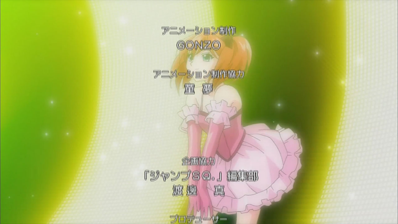 Opening and ending themes are performed by ever so pleasant to listen to Mizuki Nana, with the first episode opting to play the opening song/sequence at the end (much like the first season). Nana’s Trickster single which features the opening “DISCOTHEQUE and ending “Trinity Cross” was recently released and made it to No.2 on Oricon Daily, so kudos to all the otakus out there buying her CD. The opening sequence is quite catchy with all the girls dancing on a disco stage, which reflects Nana’s on PV DISCOTHEQUE. The PV has been floating around for the past couple of weeks after being supposedly leaked, so I decided to include it here for comparison sake.