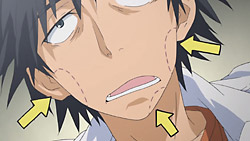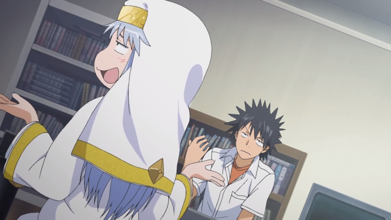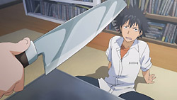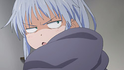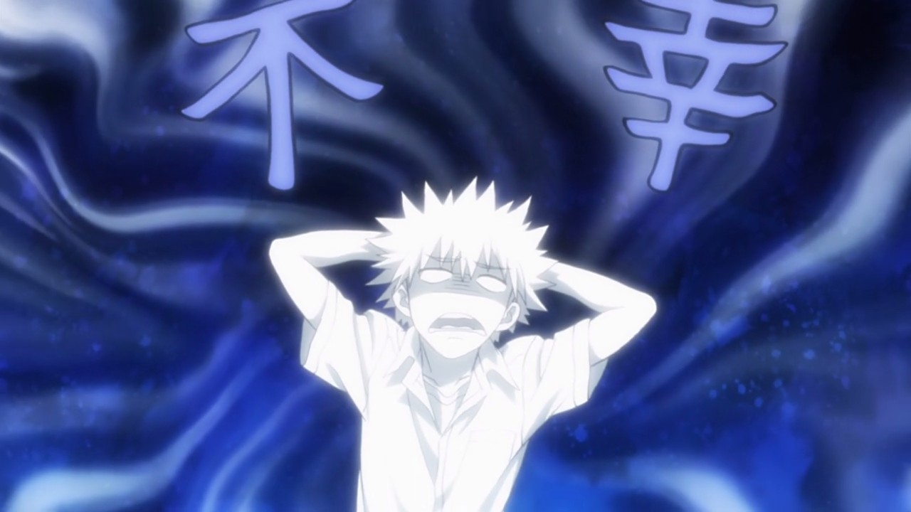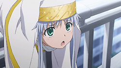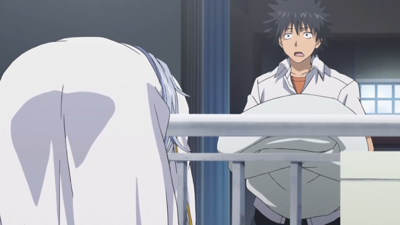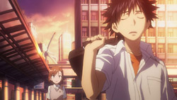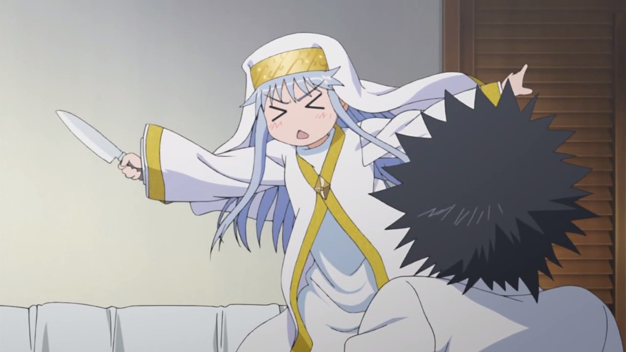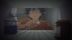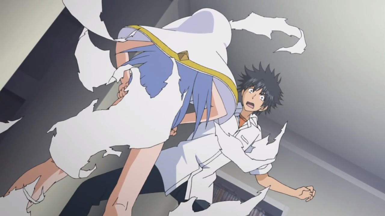 Touma is surprised to hear that Index is being chased by a magic society because he doesn’t believe in magic even though he believes in supernatural powers. He himself has a power that allows him to negate other powers by touching them with his right hand. Unfortunately, Index can’t use magic in order to prove that magic exists, so she instead decides to demonstrate with her special protective clothing. This means that Touma should be able to negate it if he touches it with his right hand, and that’s exactly what ends up happening: the clothing shreds into pieces. It leaves Index naked, and after biting Touma for what he did, she spends some time pinning her clothes back together. Touma then realizes that he has to go to his supplementary lessons at school, so Index decides that it’s time for her to leave as well. On his way out, Touma accidentally steps on and breaks his cell phone, and when Index sees this, she suggests that Touma’s right hand erases good luck as well. Although depressed from hearing this, Touma changes the subject to if Index has anywhere to go, and Index’s answer is simply that if she stayed there, then enemies would come. Touma doesn’t want to let her go out in these circumstances, but he’s left speechless after Index asks him if he’d follow her to the depths of hell.