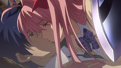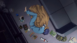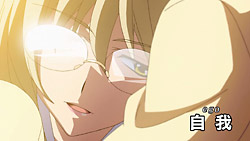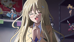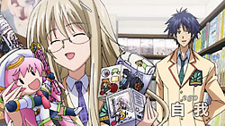 When she starts walking towards him, Takumi runs off in fear and returns home, only to realize that he brought with him one of the stakes. He panics until Seira appears and suggests that it was all a delusion, and Takumi convinces himself that she’s right. The next day, however, he gets the feeling that he’s being watched and thinks that it might be the pink-haired girl. It turns out to be just a girl with long hair and glasses, and she appears harmless. When he sees her again later that day from across the street though, Takumi experiences a delusion where she charges at him with the intent to kill, and this prompts him to run away. He ends up tripping and hurting himself, and the girl comes over to help him. She introduces herself as Kusunoki Yua and claims that she became interested in him after just one look at him. Takumi tries to get her to go away, but since he’s hurt, she helps him home. Once there, Yua recognizes the Seira figure that Takumi has on his desk, and it turns out that she’s a fan of the anime series as well. Takumi tells her all about his collection of Seira figures and then experiences a delusion where he thinks Yua is confessing to him. He’s knocked out of the delusion when Yua trips over a stack of CDs, and as she helps him clean up, she notices the stake he brought home. Not letting on what she saw, she proceeds to ask him to accompany her to the store to place an advance order on a Seira figure. Takumi wants to refuse because he thinks that it’s a trap, but when he sees her about to cry, he agrees on the date.