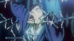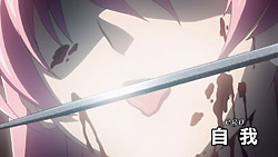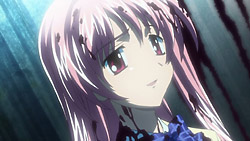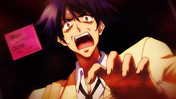 Once he’s by himself again, Takumi goes back to his online chat and is surprised when a user by the name of Shogun suddenly shows up with a link to an image. This Shogun person claims that more incidents will occur like the ones that have been happening, and he spams a series of image links. Takumi accidentally clicks one and is shocked at the sight of a dead man pinned to a wall by dozens of stakes. This freaks him out so much that he has to go to a net cafe to relieve some stress, and on his way out, he notices that the door of one of the other booths is open. Inside this empty booth is a bag with a set of cell phone straps similar to the one his sister has, and the computer screen shows a site about New Generation. As he heads home, Takumi suddenly finds himself alone in a dark alley, and he hears a hammering in the distance. When he goes to investigate, he finds a dead-end littered with the same stakes from the grisly image, and a pink-haired girl is finishing up nailing them into the same bloody corpse. It gets even worse when the girl turns around, identifies him by his name, and claims that she wanted to see him.