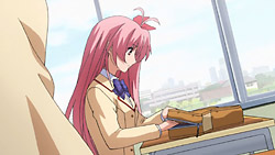 The following day, Takumi goes to school and is shocked when the pink-haired girl sits down next to him, smiles, and greets him good morning.
