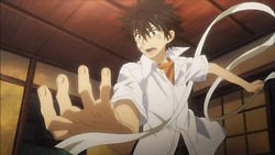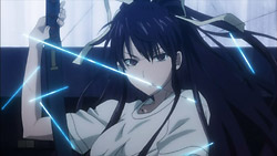 Introducing herself as Kanzaki Kaori, the girl with the sword doesn’t want to reveal her magic name if she doesn’t have to. She claims to want to take Index into custody, but Touma refuses, so Kaori demonstrates her sword skill by cutting the blade off a wind turbine that’s a long distance away. She claims that her Nanasen ability allows her to kill seven times in an instant and that it’s a guaranteed kill. Right as Touma is thinking about using his right hand, Kaori reveals that she knows about it from Stiyl. Touma, however, still tries to charge at her and attack with it. She keeps him away with her Nanasen ability, and after a second failed attempt, Touma realizes that Kaori has super-thin wires deployed all around. Kaori explains that her katana isn’t for decoration and that getting past Nanasen would bring a technique called Yuisen. She then goes back to how she doesn’t want him to make her say her magic name, and despite his now injured right arm, Touma still tries to run at her. Kaori responds by hitting him in the gut with her sword sheath before kicking him to the ground.