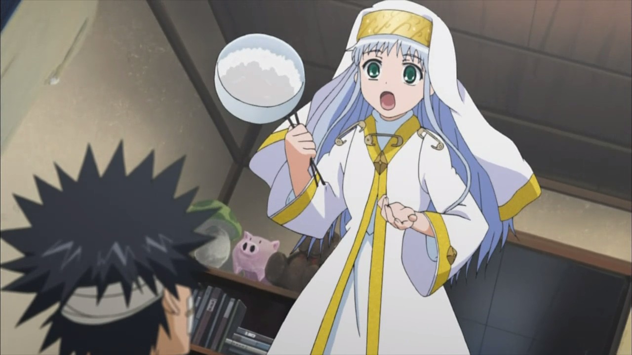 23. Really the only solution I can see for Index is somehow having Touma’s right hand cancelling out her ability to memorize everything. The issue really is her brain being unable to store all the information she is picking up. Really its hard since the story has to go somewhere. Just having her memory being wiped doesn’t solve it since she’ll just forget Touma. Also no reason for her to stay in that city and have the series continue.