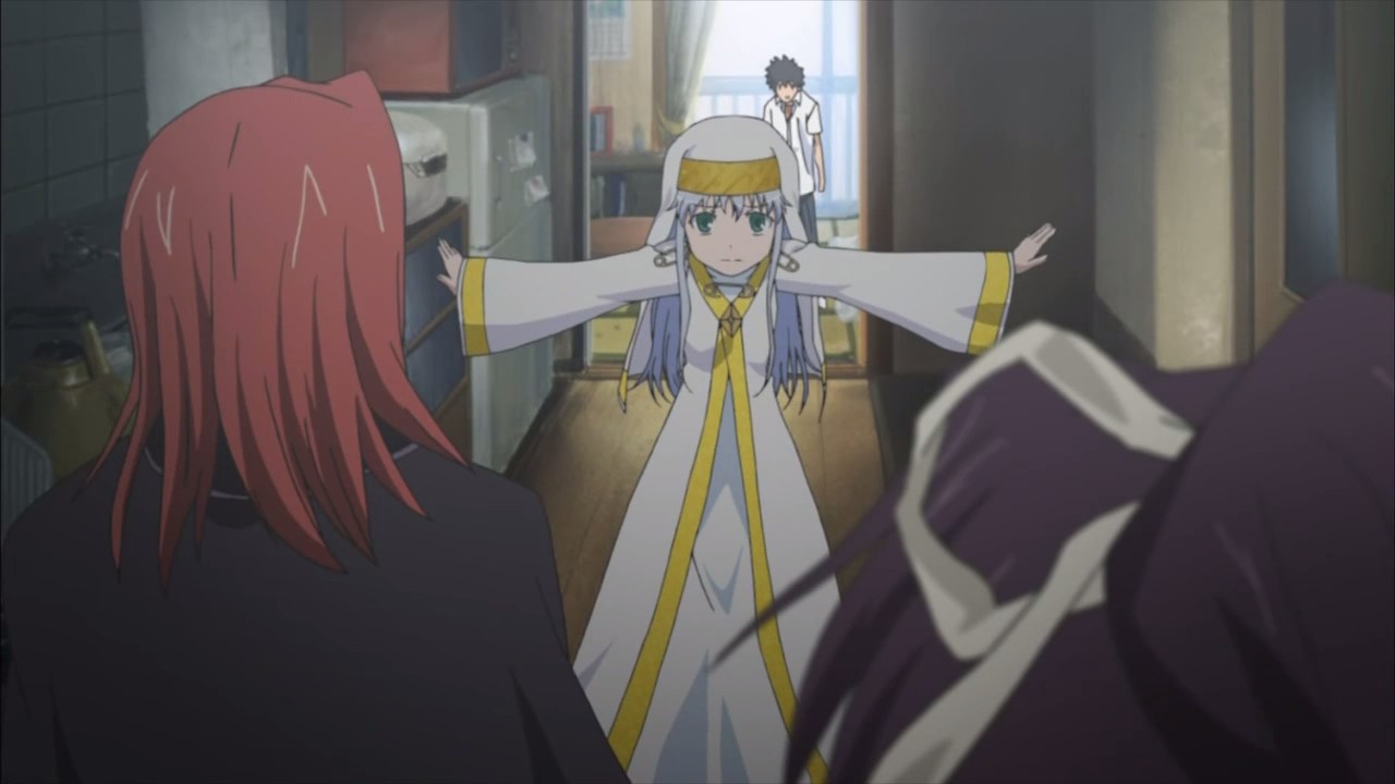 Three days later, Touma wakes back up in Komoe’s apartment with Index watching over him. When he finds out how long he’s been asleep, he remembers what Kaori had said about three days, but since Index still knows who he is, her memory must still be intact. Touma is glad about this, but Index then expresses her feelings over how she didn’t know that he was fighting and couldn’t help him – Komoe was the one who had brought him back. In the subsequent conversation about his bandage, the topic of magic comes up, and Touma feels that not using magic is fine. He doesn’t want to see Index talking magic, and that causes her to realize that she woke up again. She’s not fond of her unconscious voice, and she’s scared that she’s becoming a cold machine. Index then tries to feed Touma, but she ends up spilling the food on his head. This all is interrupted by the arrival of Kaori and Stiyl at the apartment, but Index tries to make them go away and attempts to protect Touma by saying that she’ll do whatever they want.