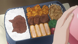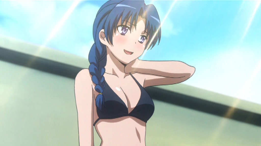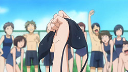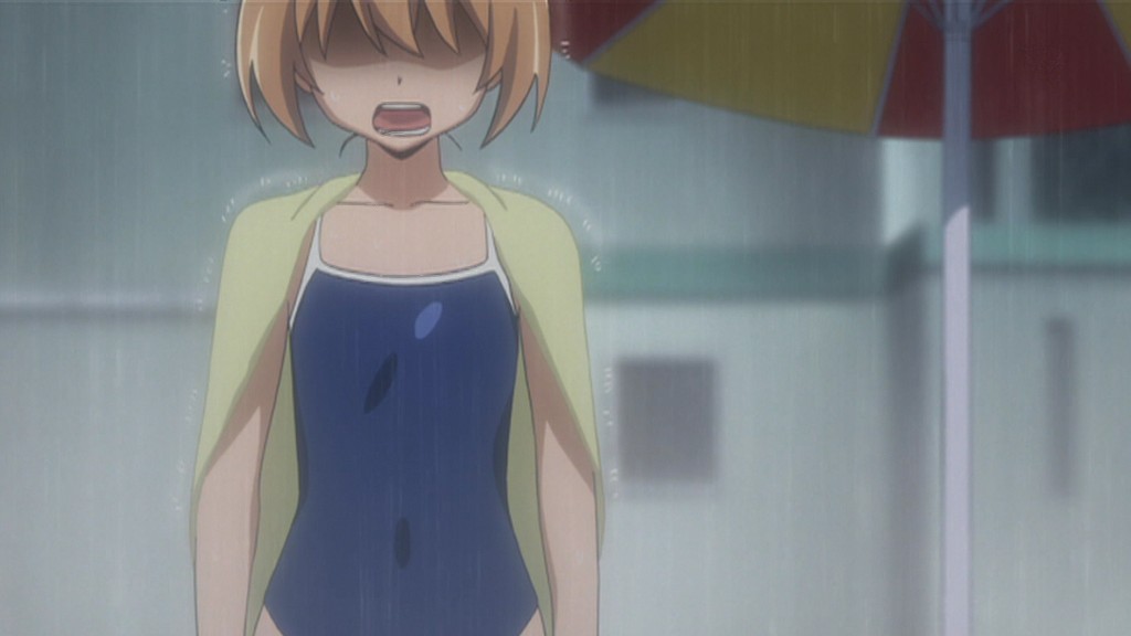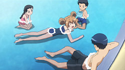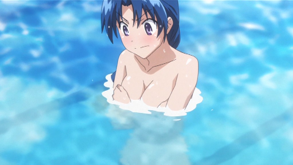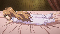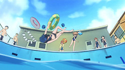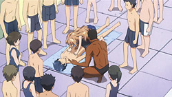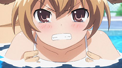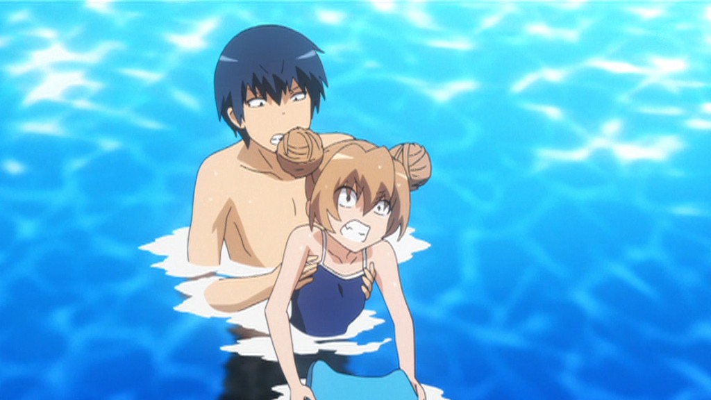 The next morning, Ryuuji brings Taiga a boxed lunch like always, and although she accepts it, she still refuses to swim. When it comes time for the competition, everyone else gathers at the pool, but Taiga doesn’t show up. Instead, she back in the classroom about to have lunch, but when she opens what Ryuuji packed her, she finds the box full of meat items, just like she had wanted. Right as Minori is thinking about calling off the competition, Taiga shows up at the pool decked out in flotation devices. She starts the race off by throwing all the objects at Ami and then ripping off Ami’s bikini top while in the water. This gives Taiga a head start since Ami is forced to retrieve her top, but that advantage is short-lived because Taiga hurts her leg as she tries to make the turn back. Ryuuji dives in to help her, but Taiga insists on continuing and tells him to be happier that his master is working so hard for him. Ami passes Taiga at this point, so Ryuuji gives her a push forward and lets her go. Before the race finishes however, several of the guys who were spectating fall into the pool right onto the spot Ryuuji is. He gets hit and starts drowning, and Taiga immediately notices. She saves Ryuuji, but after she gets him to safety, she refuses to let anyone touch him because no one else noticed or tried to help. Bawling now, she declares that Ryuuji belongs to her, and the somewhat-conscious Ryuuji smiles.