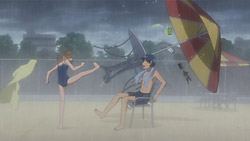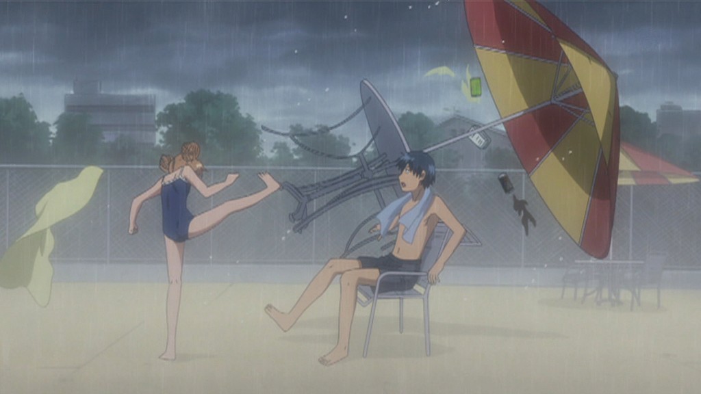 Well, Toradora continues to pleasantly surprise me with how good it can be. Most of the episode leads up to the showdown between Taiga and Ami while reflecting on the reason Taiga is doing it, and although the race itself was interesting (mainly because Taiga didn’t exactly play fair), the most powerful scene – touching even – was when Taiga protects Ryuuji and refuses to let anyone touch him after he almost drowns. It’s just a shame she goes back to treating him like a dog afterward. I guess though that how you view all that depends on if you think that Taiga and Ryuuji’s special relationship will ever develop into them becoming a couple – note that I’m not using the word love because I think that to an extent they already do love each other, just not necessarily in the romantic way – or if they’ll simply continue to grow their bond while aiming for Kitamura and Minori respectively. The latter is probably what will keep the story going, but I wouldn’t rule out the former for the end of the anime or whenever the novels finally end.