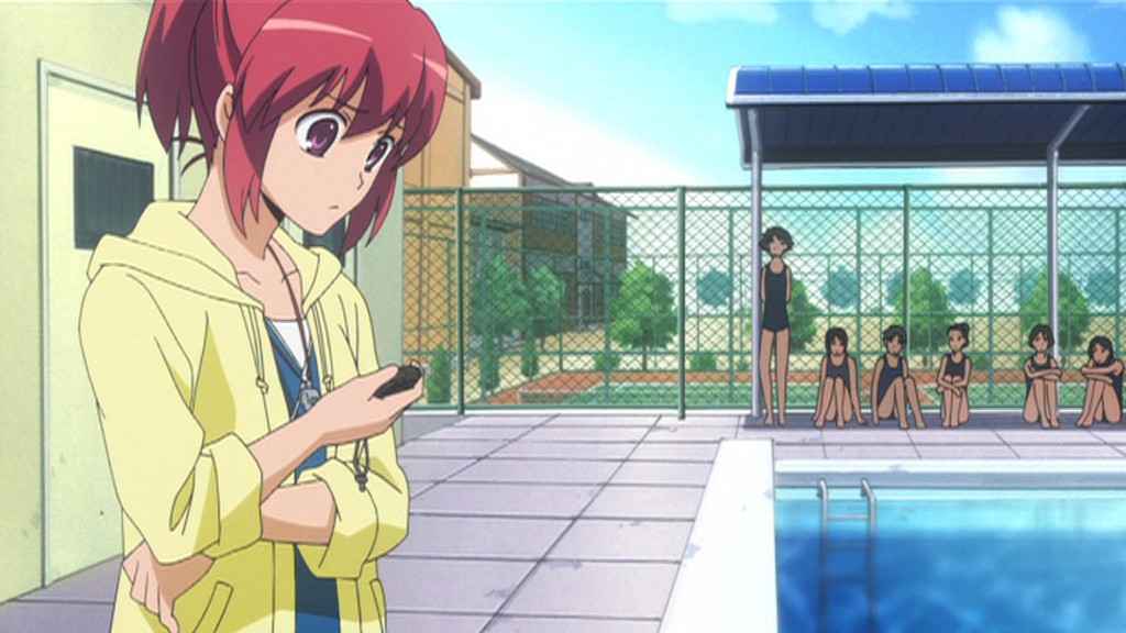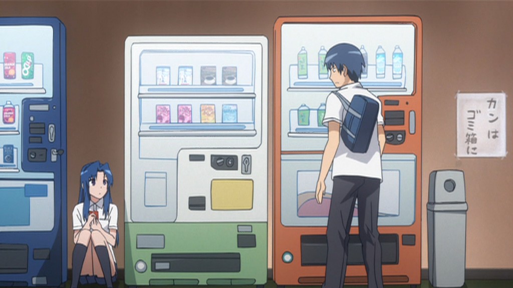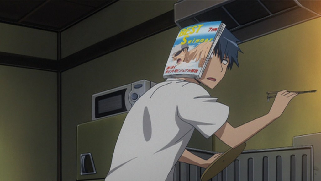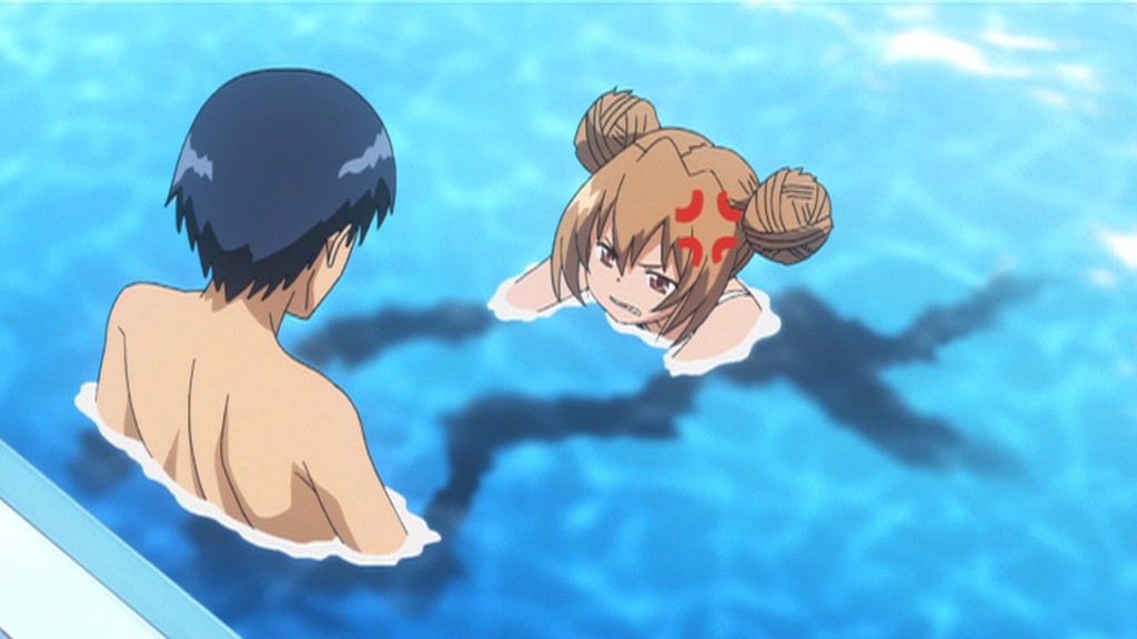 Taiga isn’t happy that the competition is chosen to be a 50-meter freestyle swim, however she still shakes on the deal with Ami. The general feeling in the class is that Ami will win, but Ryuuji thinks that Taiga can pull it off. He tries to train her at the school pool, but Taiga doesn’t like practicing while everyone is watching. Regardless, Ryuuji is under the impression that Taiga is doing all this because she doesn’t want Kitamura to go to Ami’s villa, but when she hears him say this, she throws a magazine at him and just wants him to make her dinner. Taiga spends the next few days practicing in any way she can outside of the pool and her real chance comes when Kitamura – who believes in her – gives her and Ryuuji a pair of tickets to the public swimming pool. That same afternoon, Ryuuji runs into Ami by the vending machines, and Ami comments on how cute Taiga is when jealous. Ryuuji thinks that Taiga isn’t jealous but rather simply doesn’t like Ami, and that prompts Ami to call him an idiot. Ryuuji then tries to get Ami to stop provoking Taiga, but she declares that she’s serious about winning and spending the summer with him. She suggests that the two of them get along well, and this causes Ryuuji to blush and deny it. On his way out of the school building, Ryuuji is stopped by Minori who reveals that she knows that it was he who modified Taiga’s swimsuit. Taiga had told Minori in the past about how Ryuuji does all sorts of household chores, and Minori sees that as amazing, so she entrusts Taiga to him.