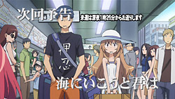 Can’t wait to see this episode and the next; makes me wonder if Takasu’s going on a date with Taiga/Minori. Plus, why’s Ami sitting down on the beach with Kitamaru? O_O