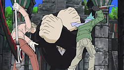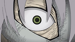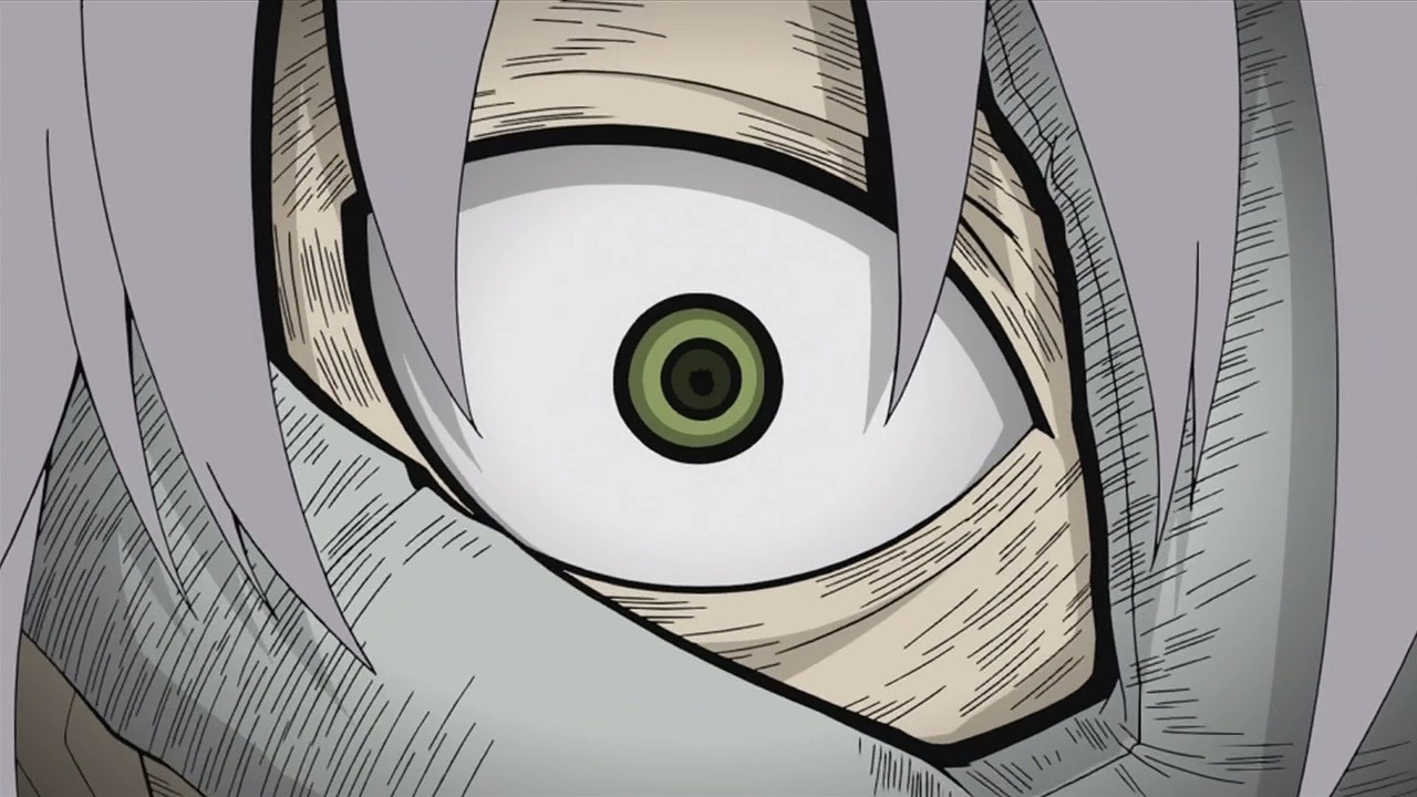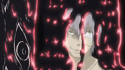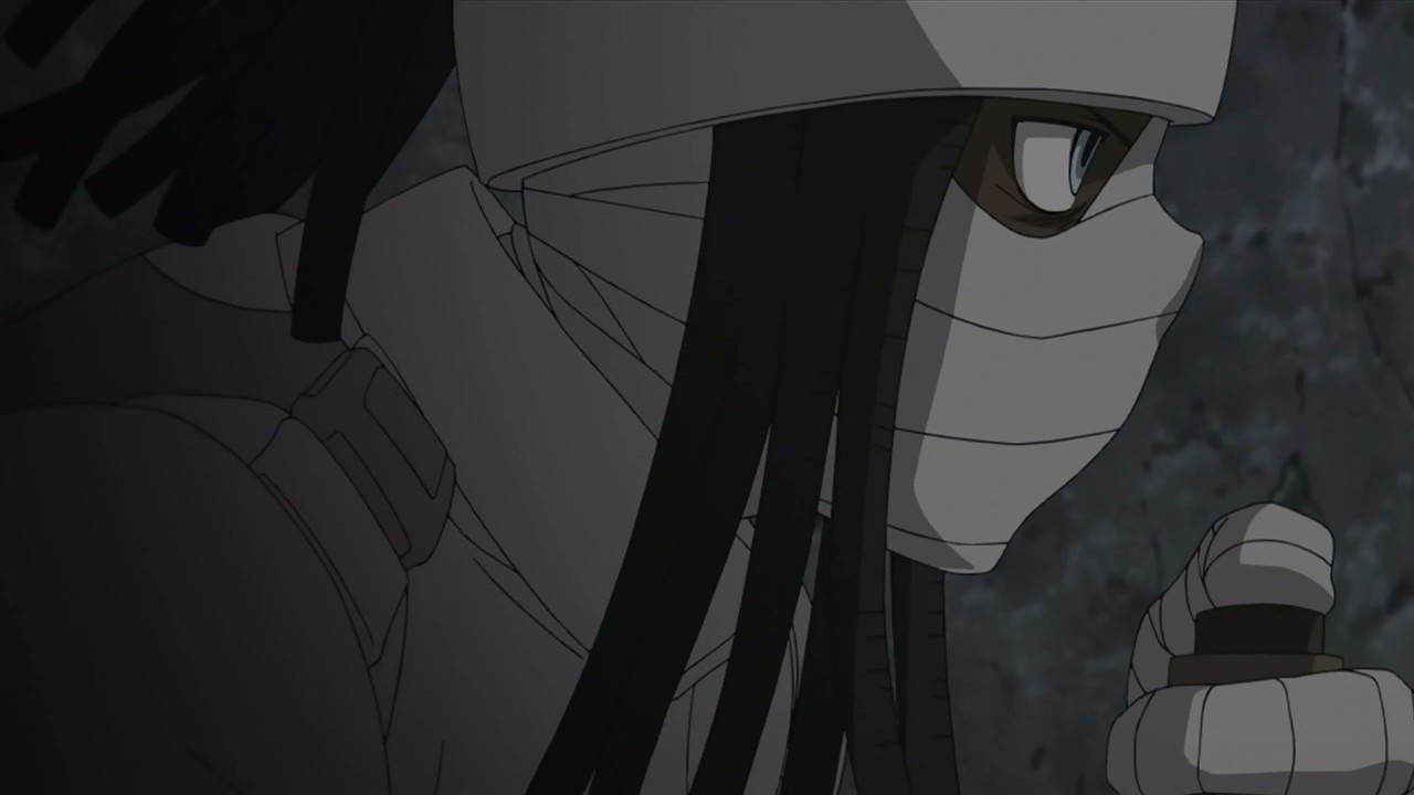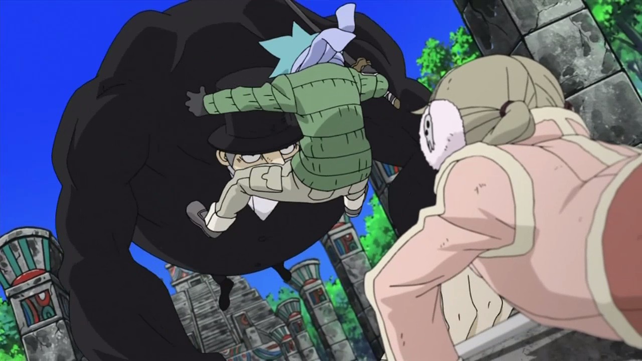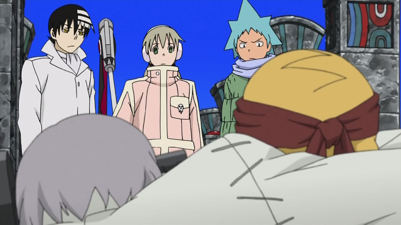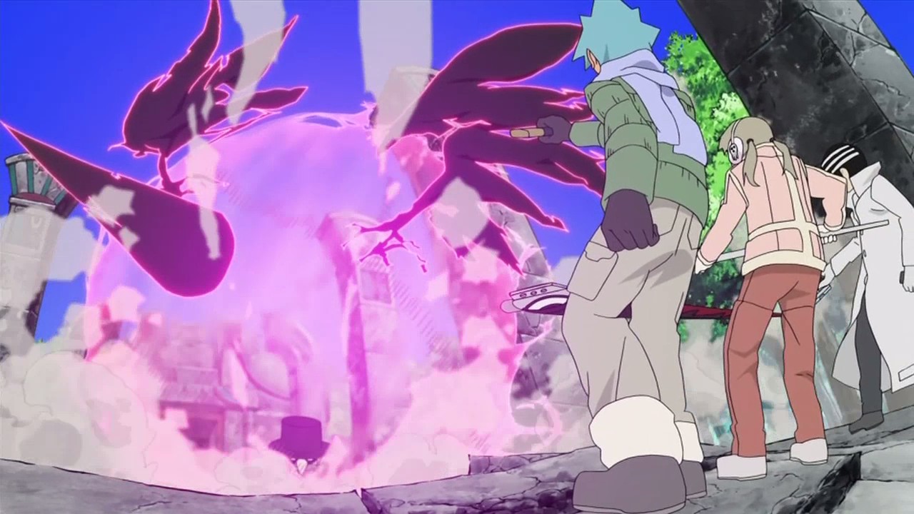 Inside the magnetic field, Stein is losing to the madness, and Marie is powerless to help him. He gets a slightly better grip on himself when Maka, Black*Star, and Kid show up, and those three point out that Marie and Stein have already been inside for 20 minutes. Since the trio have 10 more minutes, they decides to stick around to search for the tool, and Marie can’t stop them. At the base of the pyramid, they run into Mosquito and realize that he’s got the tool. In order to fight, Mosquito returns his body to its state 100 years ago, bulking up his upper body considerably. The start of the battle though is briefly interrupted by the sudden appearance a moving image of Eibon. Despite this, Black*Star doesn’t want to waste time and attacks Mosquito. Kid is concerned about Eibon, however he ultimately chooses to help his friends in fighting instead of following the mysterious figure. The three then unleash some powerful attacks on Mosquito, but these have very little effect