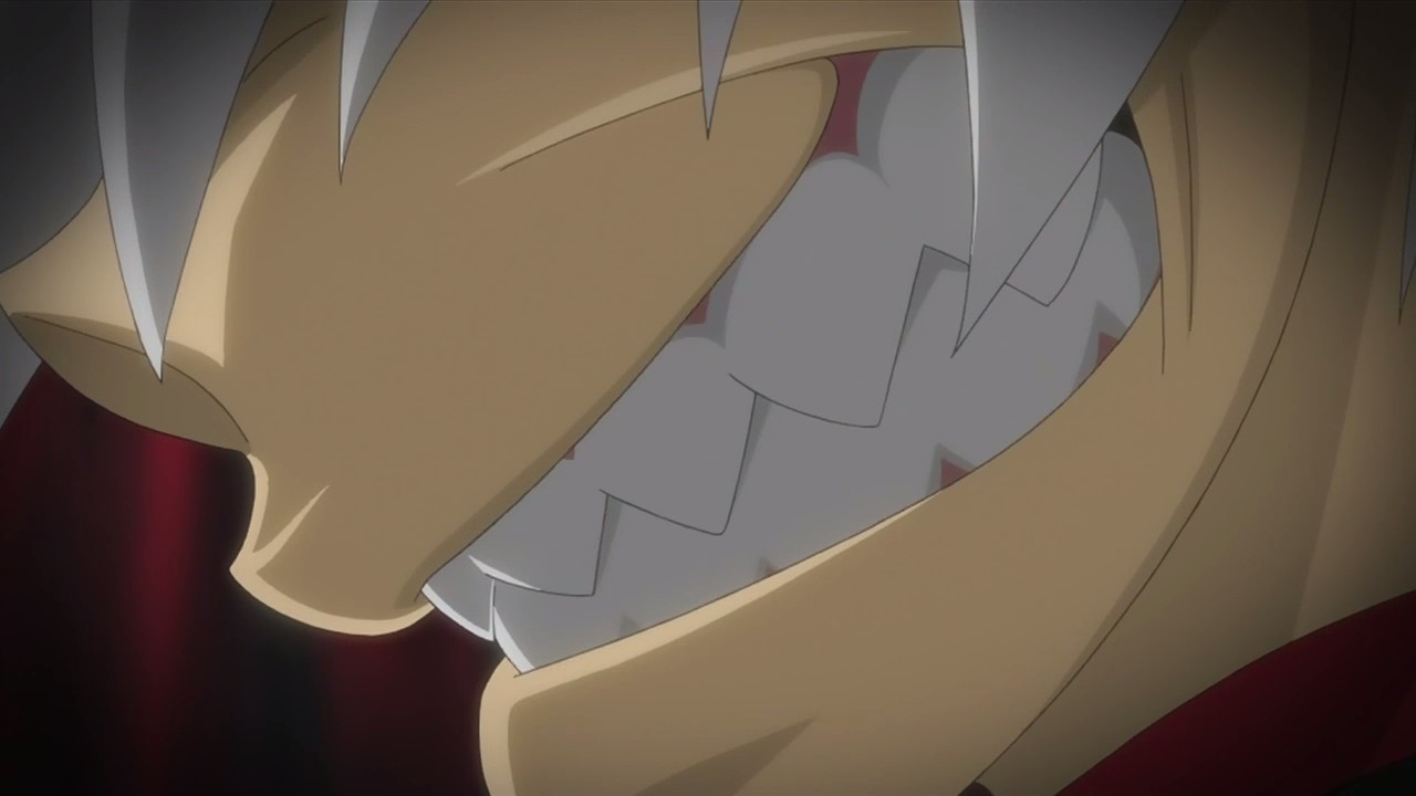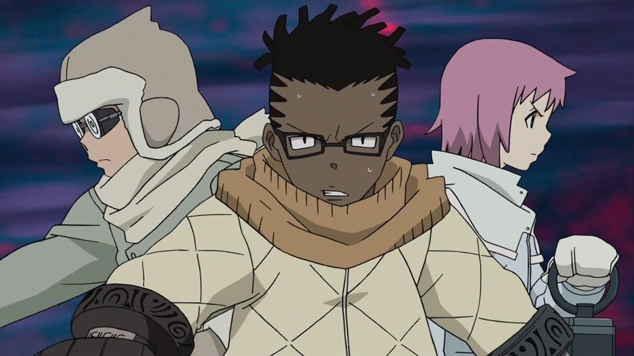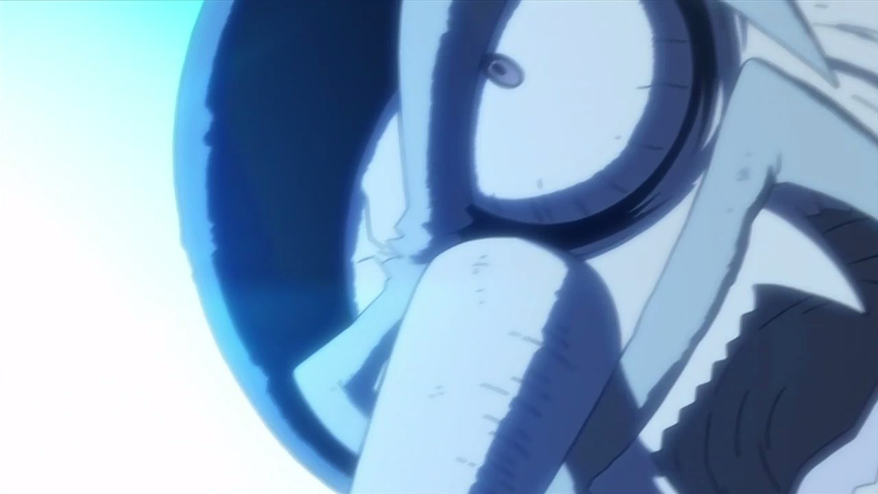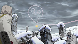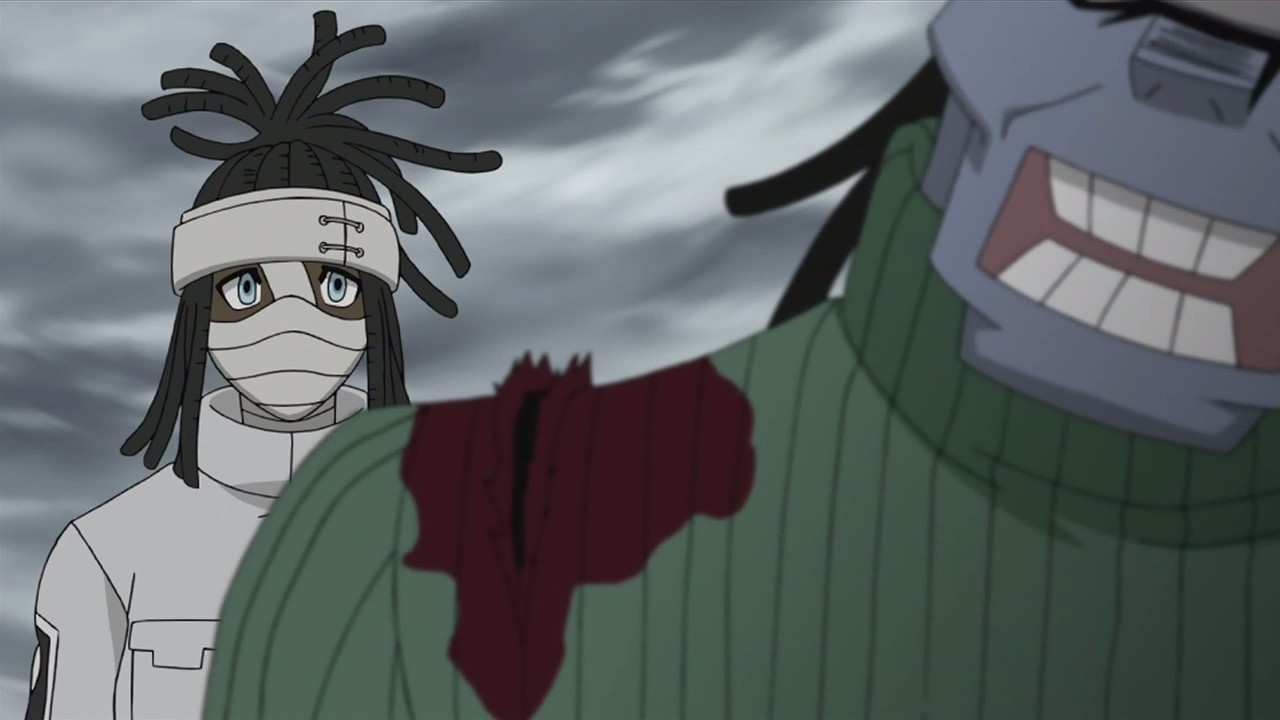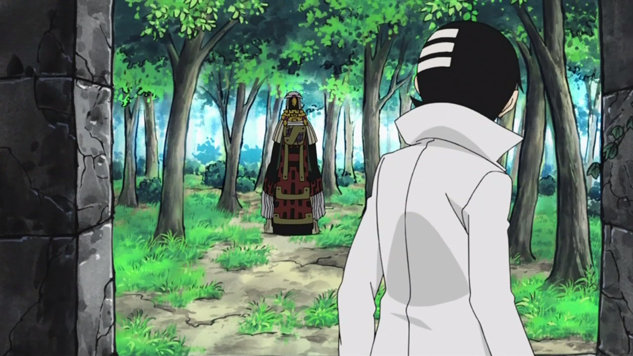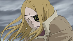 Inside the magnetic field, Stein is losing to the madness, and Marie is powerless to help him. He gets a slightly better grip on himself when Maka, Black*Star, and Kid show up, and those three point out that Marie and Stein have already been inside for 20 minutes. Since the trio have 10 more minutes, they decides to stick around to search for the tool, and Marie can’t stop them. At the base of the pyramid, they run into Mosquito and realize that he’s got the tool. In order to fight, Mosquito returns his body to its state 100 years ago, bulking up his upper body considerably. The start of the battle though is briefly interrupted by the sudden appearance a moving image of Eibon. Despite this, Black*Star doesn’t want to waste time and attacks Mosquito. Kid is concerned about Eibon, however he ultimately chooses to help his friends in fighting instead of following the mysterious figure. The three then unleash some powerful attacks on Mosquito, but these have very little effect