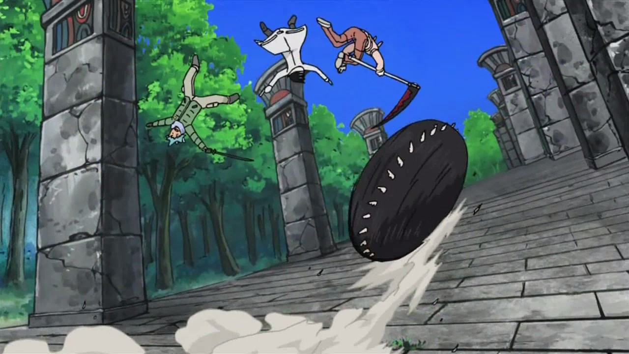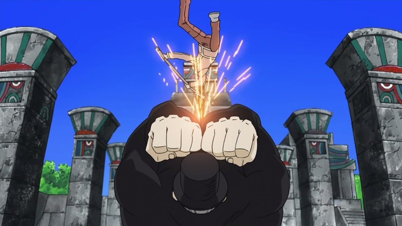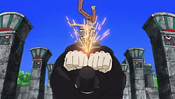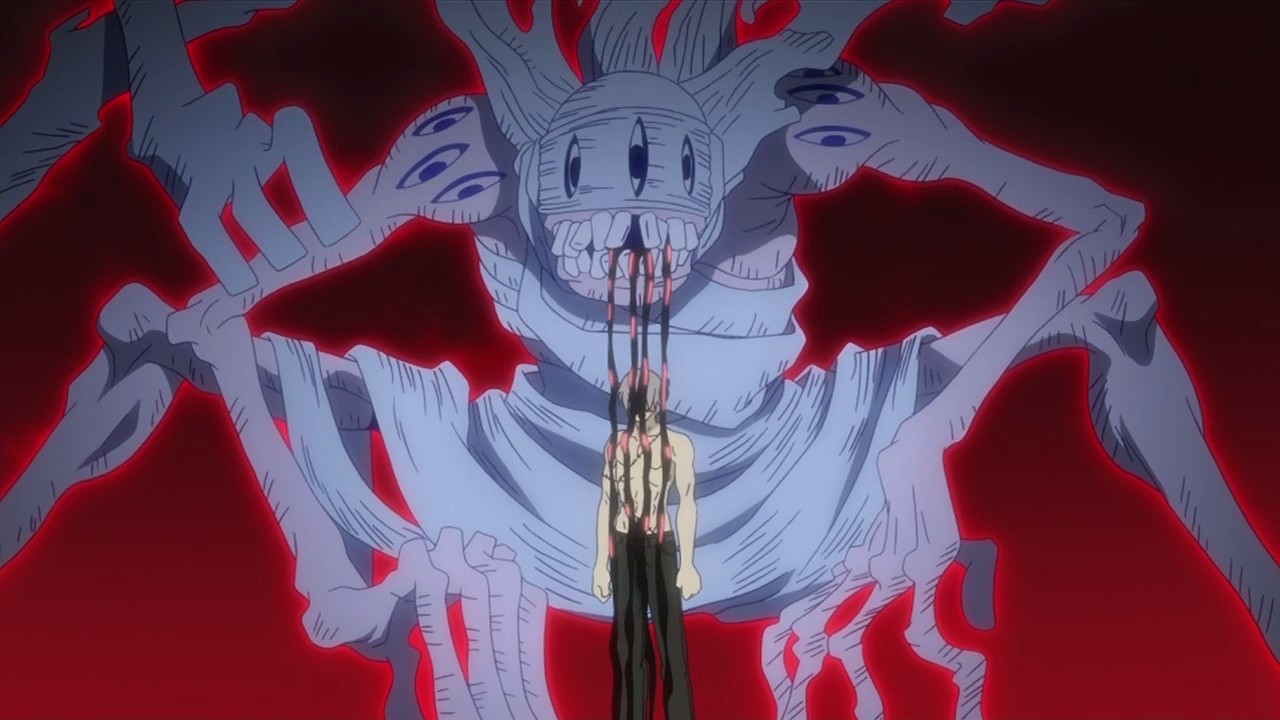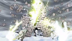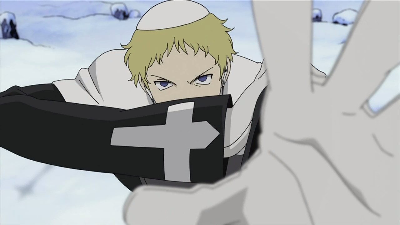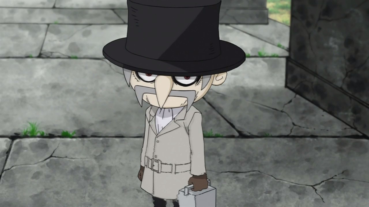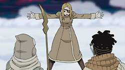 Inside the magnetic field, Stein is losing to the madness, and Marie is powerless to help him. He gets a slightly better grip on himself when Maka, Black*Star, and Kid show up, and those three point out that Marie and Stein have already been inside for 20 minutes. Since the trio have 10 more minutes, they decides to stick around to search for the tool, and Marie can’t stop them. At the base of the pyramid, they run into Mosquito and realize that he’s got the tool. In order to fight, Mosquito returns his body to its state 100 years ago, bulking up his upper body considerably. The start of the battle though is briefly interrupted by the sudden appearance a moving image of Eibon. Despite this, Black*Star doesn’t want to waste time and attacks Mosquito. Kid is concerned about Eibon, however he ultimately chooses to help his friends in fighting instead of following the mysterious figure. The three then unleash some powerful attacks on Mosquito, but these have very little effect