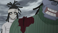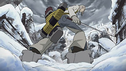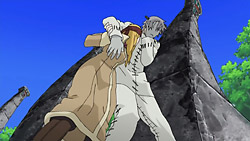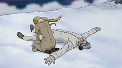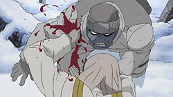Ox, Kilik, and Kim continue fighting the Arachnophobia forces, but since they’re approaching the 20-minute mark that Stein had set earlier, Kim sets out to give the signal for retreat. Ox and Kilik work together to cover her, and Kim successfully gets away from the battle. Mifune meanwhile has walked into a trap set by Nygus and Sid, and Sid tries to hold Mifune in place while a giant pillar comes swinging down towards him. Mifune forces Sid to let go by stabbing him in the shoulder, but it’s too late and Mifune gets smacked by the pillar. Although injured, Sid then charges Mifune and stabs him in the arm. Mifune counters by digging his hand into the wound he inflicted on Sid moments ago. Neither are able to bring the other down, and since Mifune doesn’t care to negotiate, the two get ready to start another round of fighting. They never do so however because Kim and Jackie draw the retreat signal in the sky, and so Sid leaves the fight.