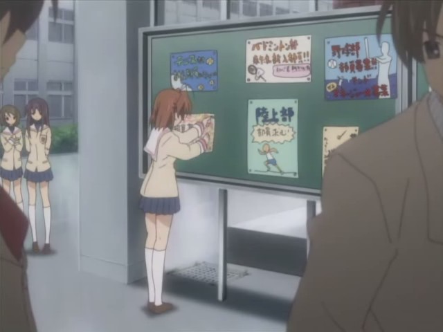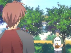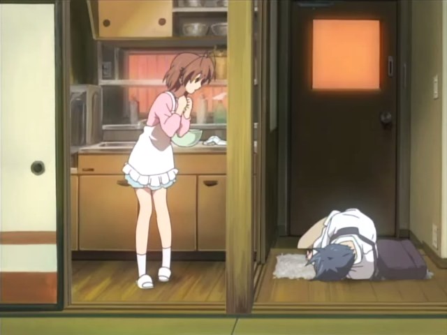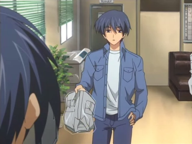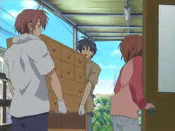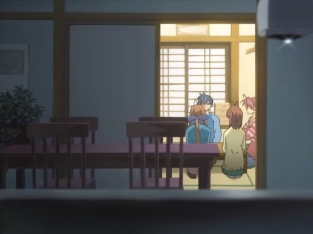 Unfortunately, recruitment for the drama club doesn’t go so well, and Nagisa is given a deadlines to find more members or else the club will be closed. Nagisa wants to talk to Tomoya about happy school things, but as time goes on, Tomoya notices that this doesn’t happen, and he finds out later that no one joined the club. On his way home from grocery shopping one day, Tomoya runs into Yuusuke who’s working on a power line. The two talk briefly about how there’s a manpower shortage in Yuusuke’s line of work since it’s a demanding job and how Yuusuke and Kouko are still hopeful that Fuuko will recover. Tomoya then heads to an agency that lists available apartments, but he finds all the places too expensive for him. Seeing everyone else going about their lives starts him thinking about what he’s doing, and he then has a chance encounter with Kyou and Ryou. The two have been really busy with college, and when they ask about him, Tomoya admits that he’s still freeloading. He reveals that he’s looking for a cheap place of his own, so Ryou tells him of a place she knows about.