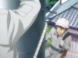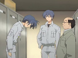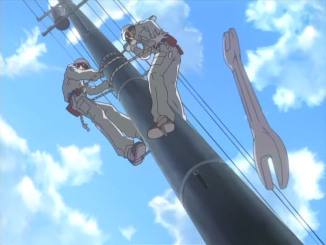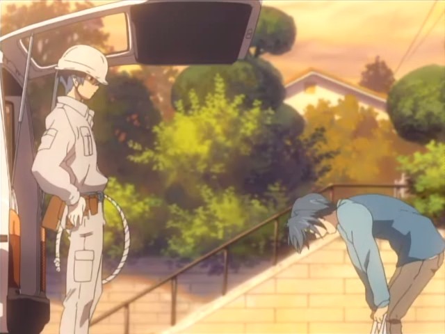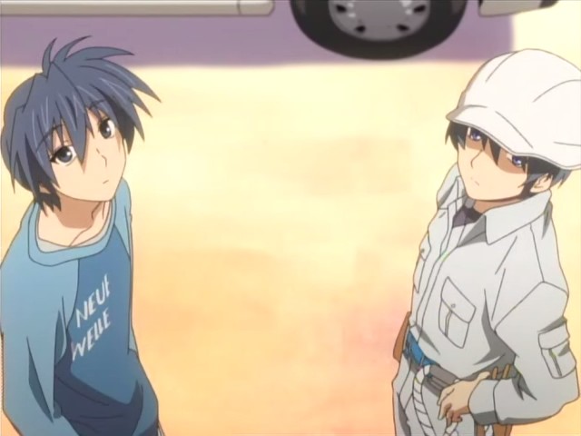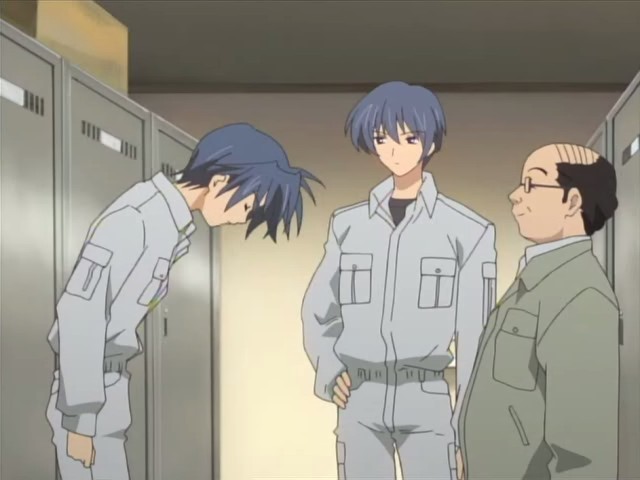Tomoya has a hard time falling asleep that night, and the next morning, he nearly gets up late. Thankfully Nagisa came to wake him up and cook him breakfast, and she wants to cook him dinner as well. His first day at the electric company Yuusuke works for starts off fairly well with a meeting with the boss. While they’re driving to their first job, Yuusuke notes that the atmosphere around Tomoya has changed and that he’s like a different person from when they first met. Yuusuke doesn’t acknowledge Tomoya as an adult yet, but he sees him instead as a child who’s struggling to become an adult. As for their job, Yuusuke is very serious about it and teaches Tomoya while he works. When Tomoya accidentally drops a wrench while high up a pole, Yuusuke yells at him because failure isn’t allowed. Yuusuke makes Tomoya realize that someone – such as a loved one – could have been under them and gotten hurt, so they have to be careful. The day’s work leaves Tomoya exhausted, and he collapses when he gets back home. As promised, Nagisa is there and has made dinner. While he eats, she tries to tell him about something good that happened in school today, but Tomoya is too tired to listen and falls asleep.